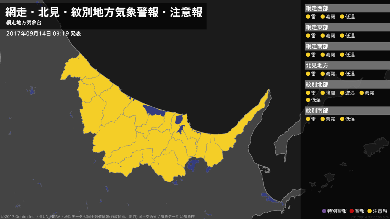 【網走・北見・紋別地方 気象警報・注意報 2017年09月14日 03:22】
