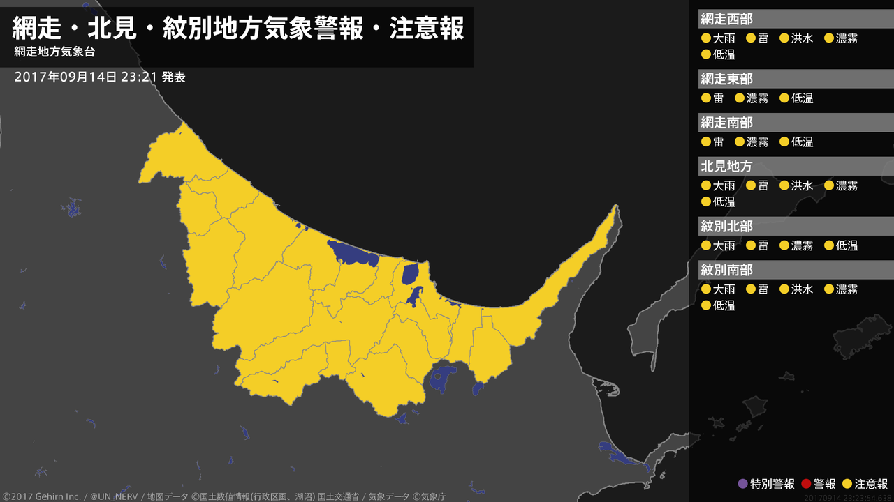 【網走・北見・紋別地方 気象警報・注意報 2017年09月14日 23:23】