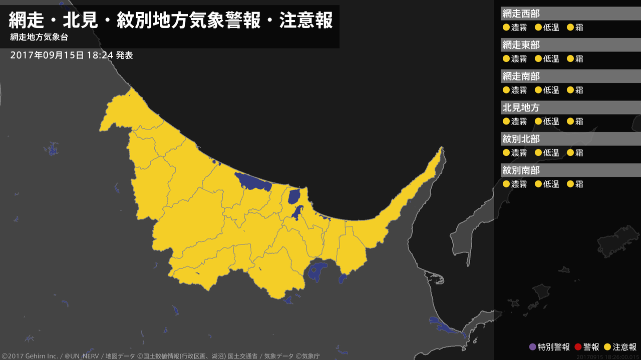 【網走・北見・紋別地方 気象警報・注意報 2017年09月15日 05:00】