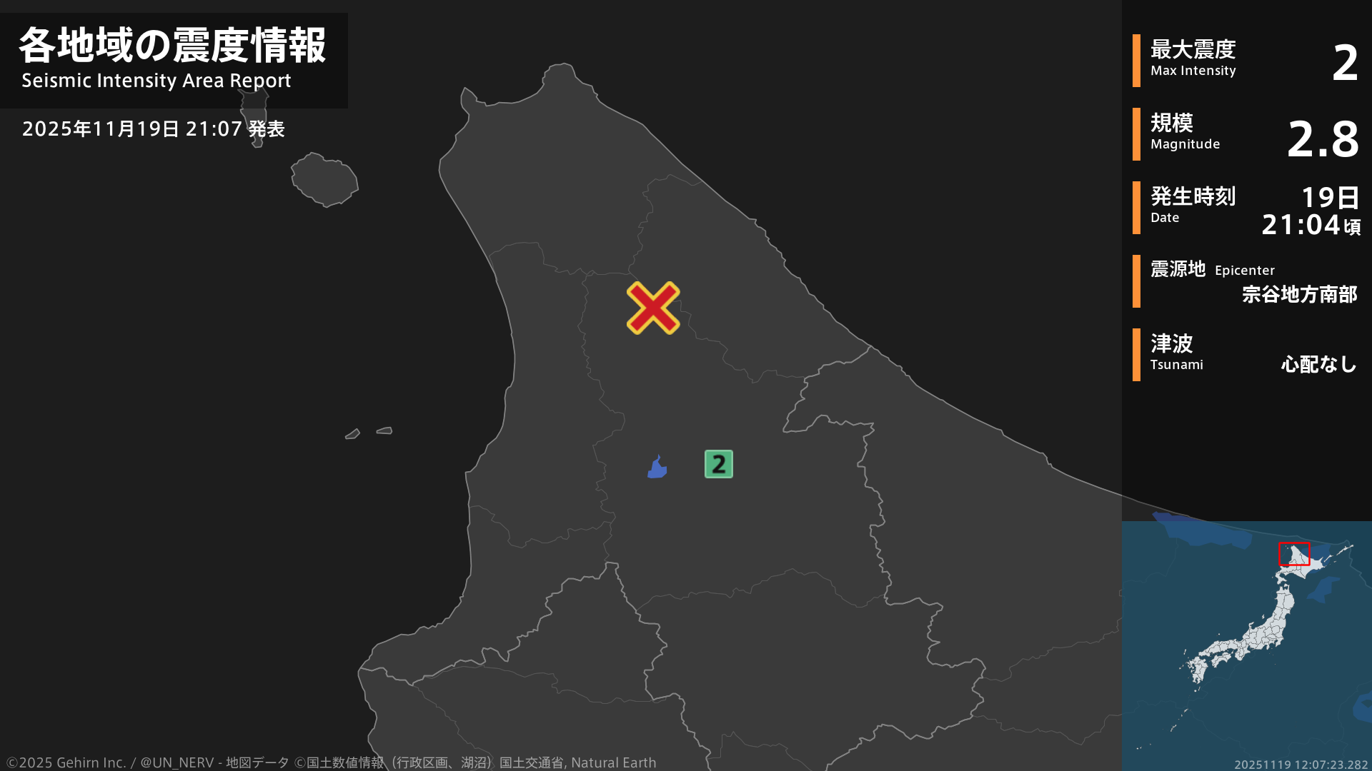 【地震情報 2025年11月19日】21時4分頃、宗谷地方南部を震源とする地震がありました。震源の深さはごく浅い、地震の規模はM2.8、最大震度2を北海道で観測しています。この地震による津波の心配はありません。#地震 #北海道