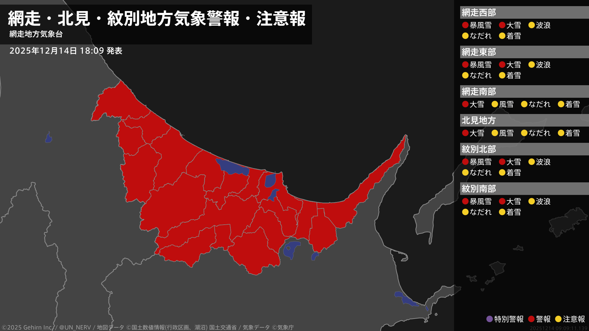 【網走・北見・紋別地方 気象警報・注意報 2025年12月14日 18:09】網走、紋別地方では、15日未明から15日夕方まで暴風雪に警戒してください。網走、北見、紋別地方では、15日未明から15日昼前まで大雪に警戒してください。#気象警報注意報 #網走・北見・紋別地方