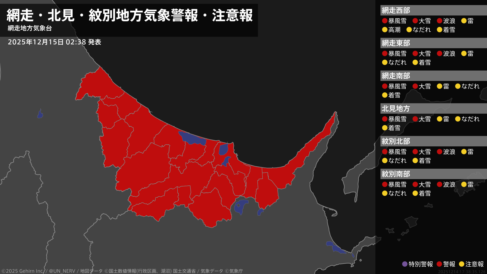 【網走・北見・紋別地方 気象警報・注意報 2025年12月15日 00:14】網走、北見、紋別地方では、暴風雪や大雪に警戒してください。網走、紋別地方では、高波に警戒してください。#気象警報注意報 #網走・北見・紋別地方
