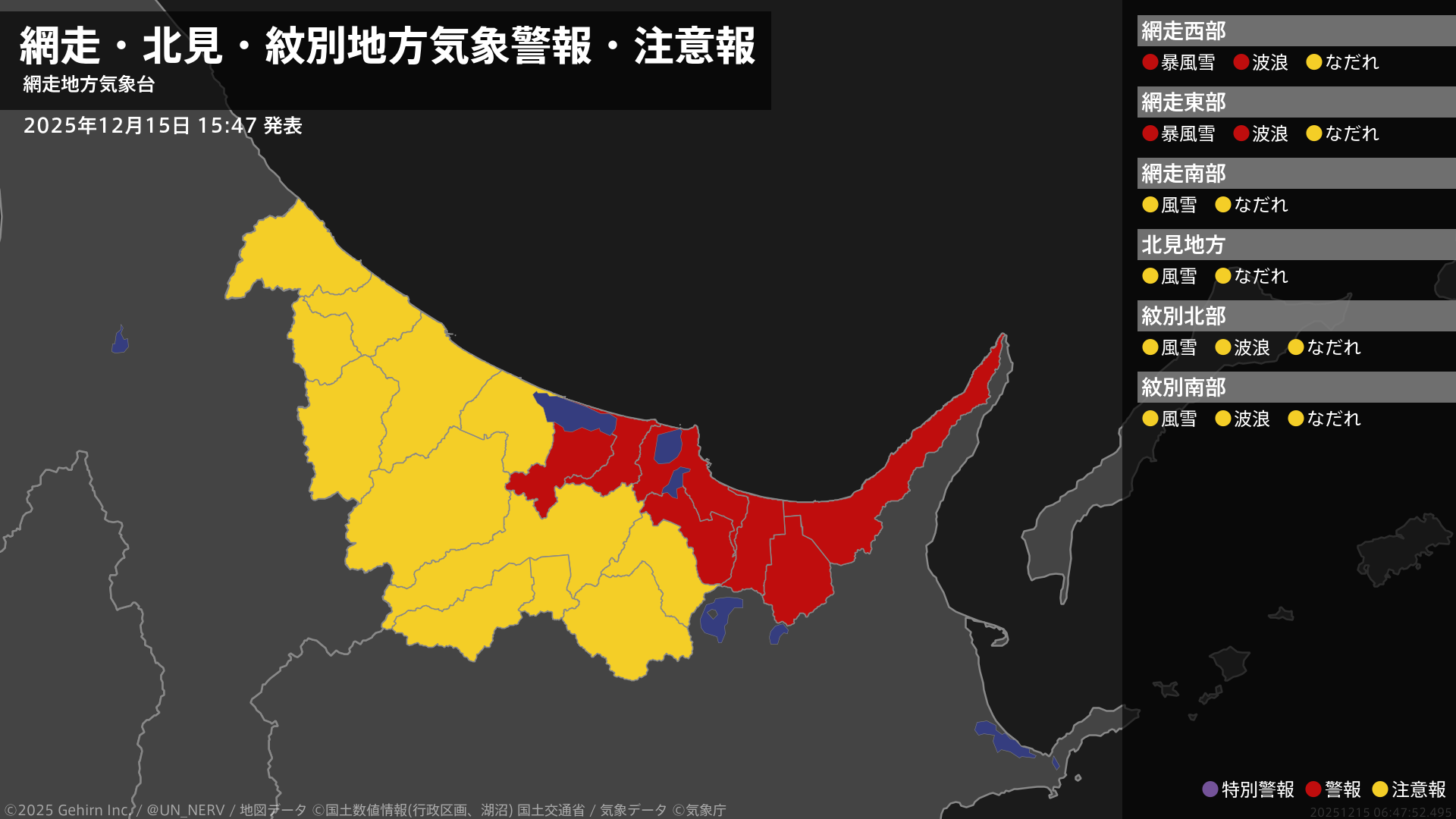 【網走・北見・紋別地方 気象警報・注意報 2025年12月15日 15:47】網走地方では、15日夜のはじめ頃まで暴風雪に、16日明け方まで高波に警戒してください。#気象警報注意報 #網走・北見・紋別地方