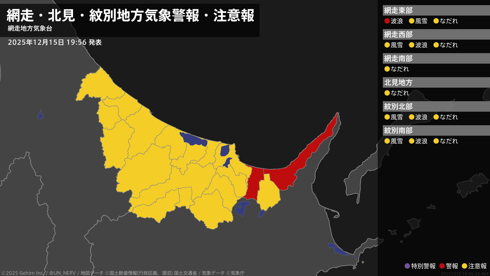 【網走・北見・紋別地方 気象警報・注意報 2025年12月15日 19:56】網走地方では、16日明け方まで高波に警戒してください。#気象警報注意報 #網走・北見・紋別地方