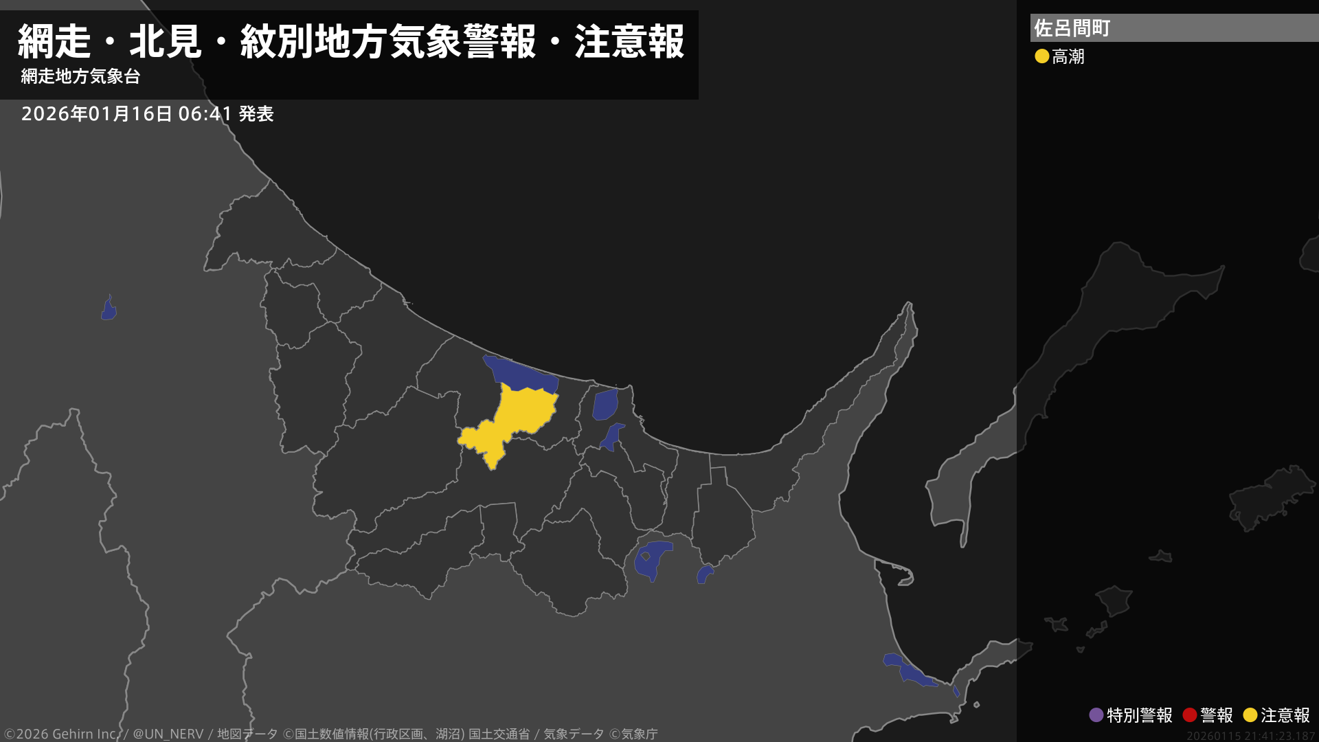 【網走・北見・紋別地方 気象警報・注意報 2026年01月16日 06:41】網走地方では、16日昼過ぎから16日夕方まで高潮に注意してください。#気象警報注意報 #網走・北見・紋別地方