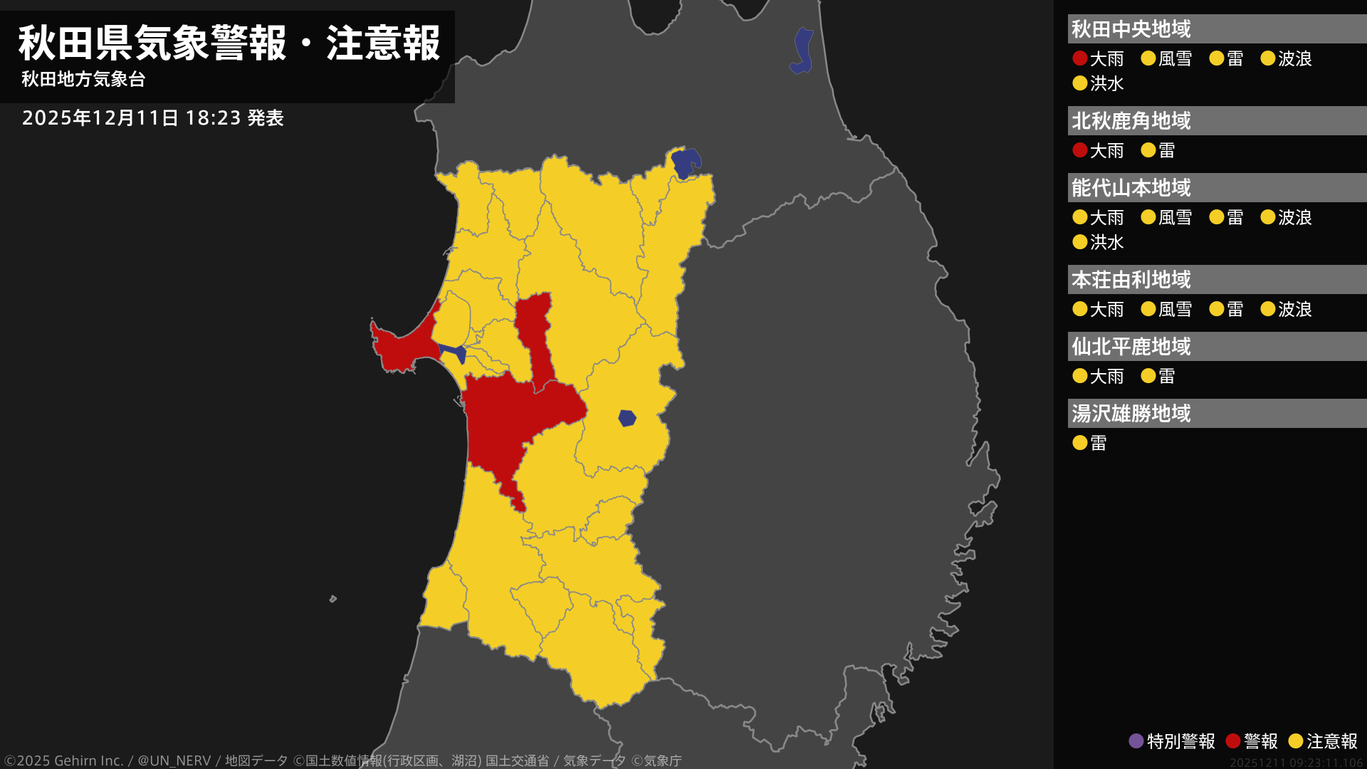 【秋田県 気象警報・注意報 2025年12月11日 18:23】秋田県では、11日夜遅くまで土砂災害に警戒してください。#気象警報注意報 #秋田県