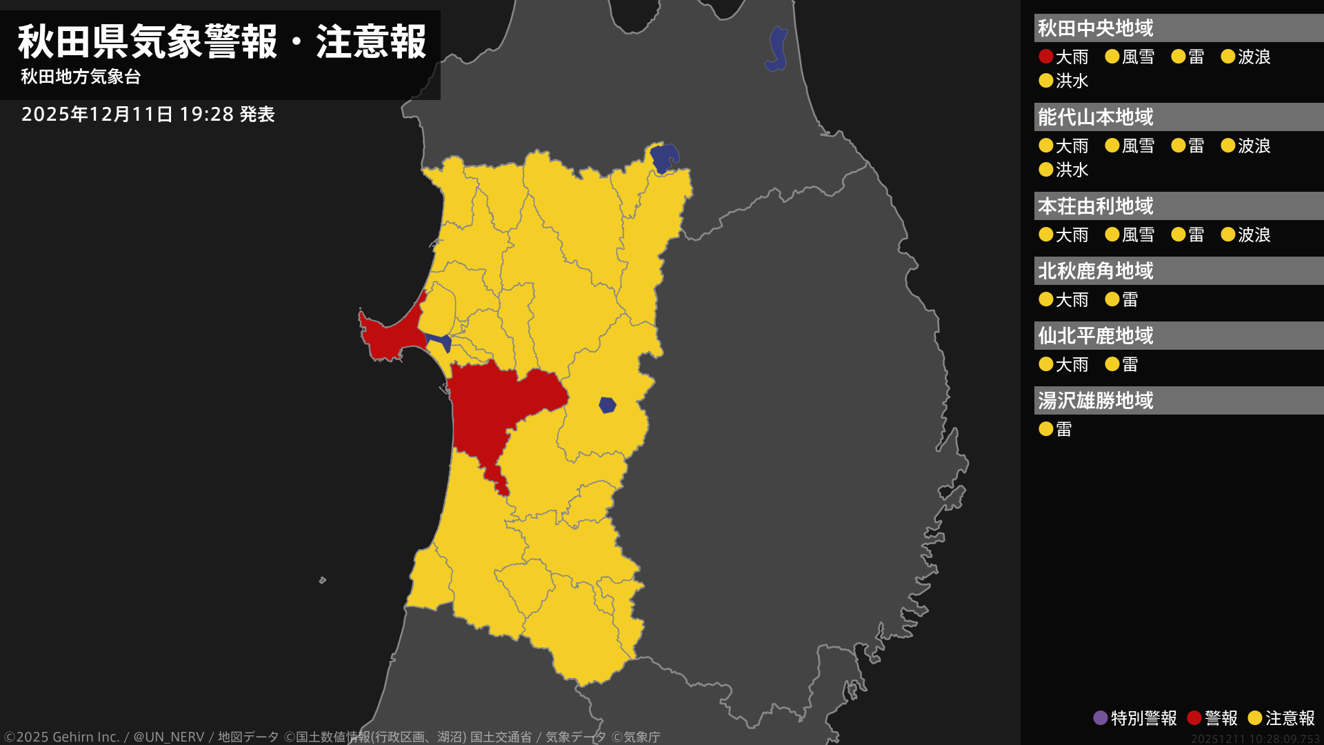 【秋田県 気象警報・注意報 2025年12月11日 19:28】沿岸では、11日夜遅くまで土砂災害に警戒してください。#気象警報注意報 #秋田県