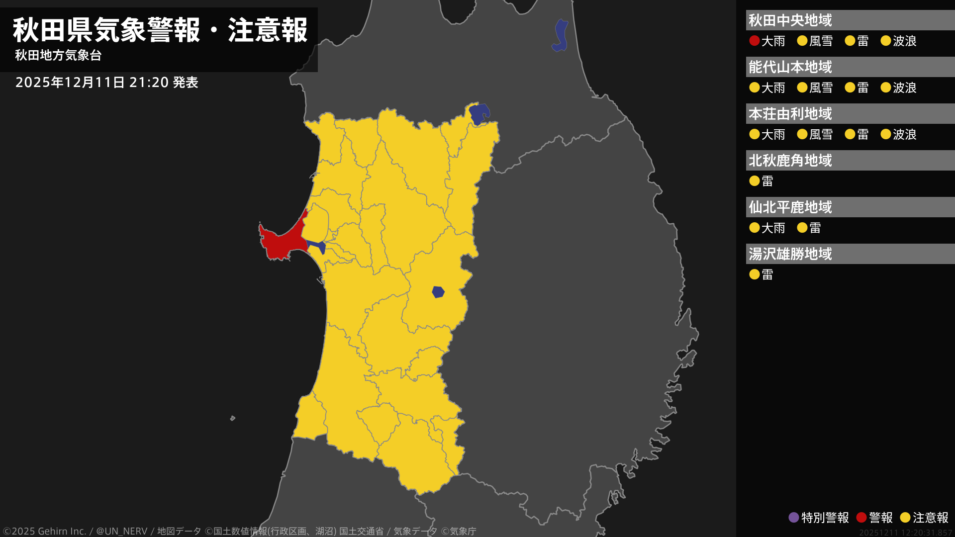【秋田県 気象警報・注意報 2025年12月11日 21:20】沿岸では、11日夜遅くまで土砂災害に警戒してください。#気象警報注意報 #秋田県
