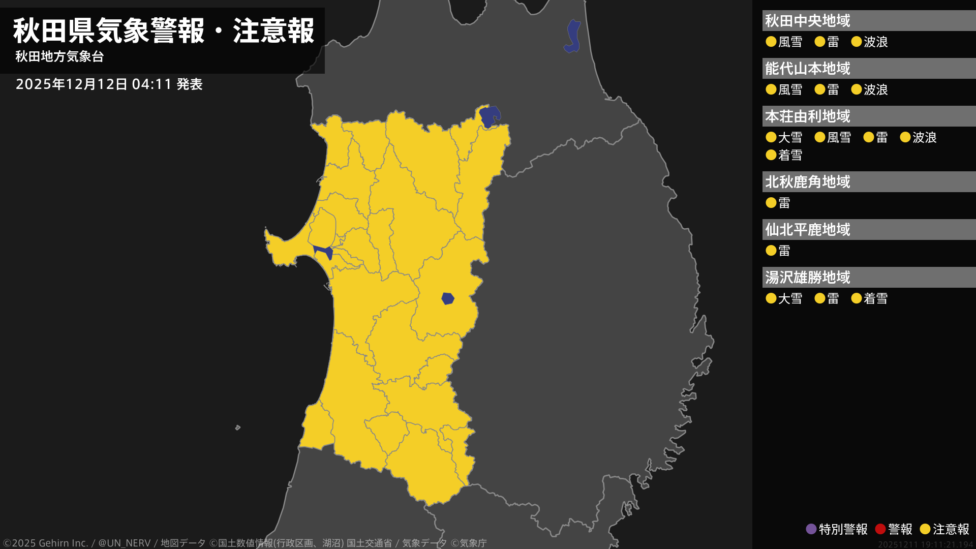 【秋田県 気象警報・注意報 2025年12月12日 04:11】沿岸では、風雪や高波に注意してください。秋田県では、大雪や落雷、電線等への着雪に注意してください。#気象警報注意報 #秋田県