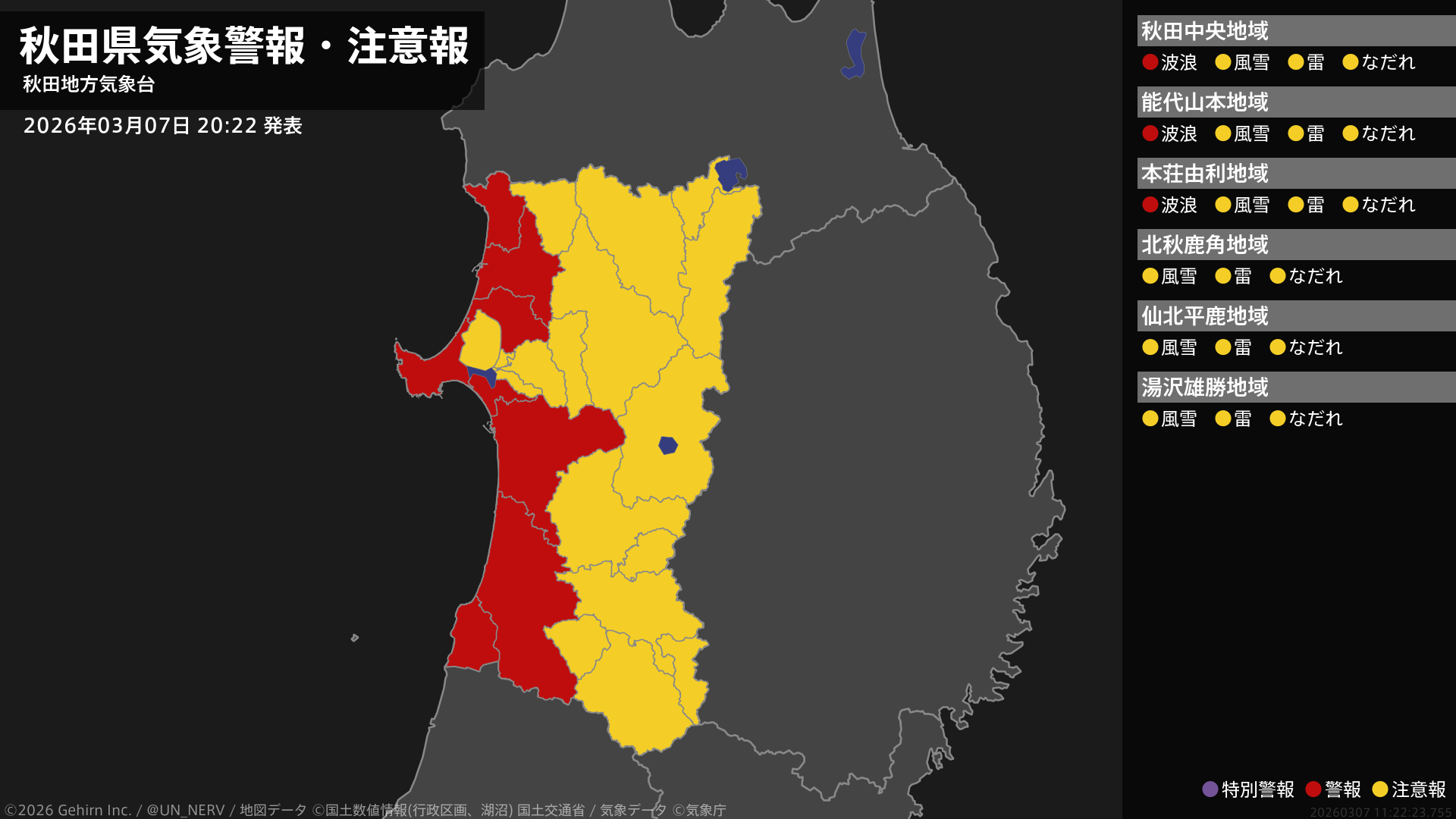 【秋田県 気象警報・注意報 2026年03月07日 20:22】沿岸では、8日明け方まで高波に警戒してください。#気象警報注意報 #秋田県