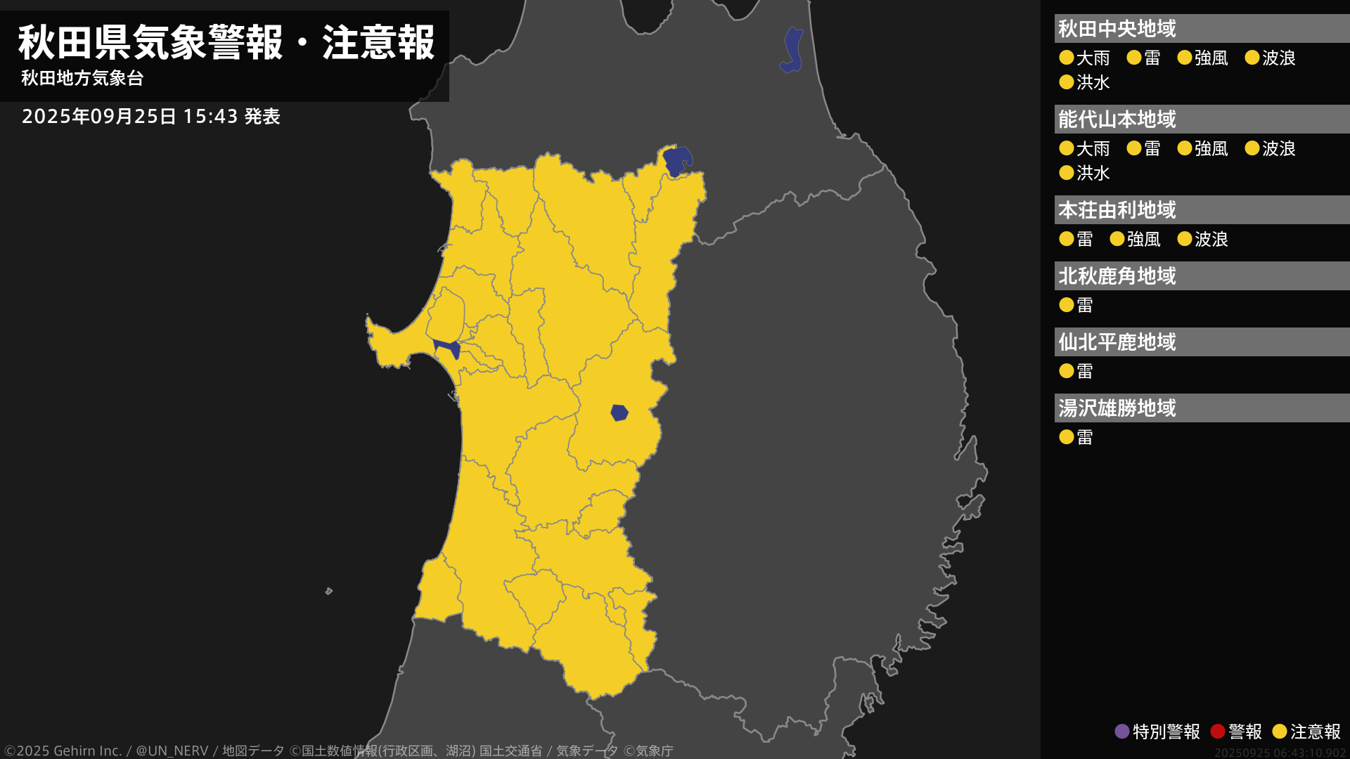 【秋田県 気象警報・注意報 2025年09月25日 15:43】沿岸では、土砂災害や低い土地の浸水、河川の増水、強風、高波に注意してください。秋田県では、竜巻などの激しい突風や落雷に注意してください。#気象警報注意報 #秋田県