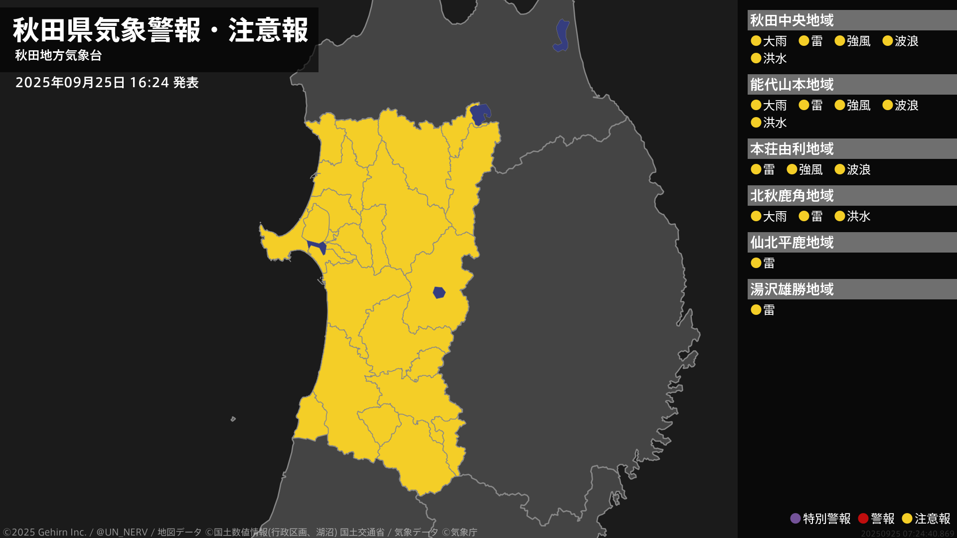 【秋田県 気象警報・注意報 2025年09月25日 19:12】秋田県では、25日夜遅くまで土砂災害や竜巻などの激しい突風、落雷に注意してください。沿岸では、25日夜遅くまで河川の増水に、25日夜のはじめ頃まで強風や高波に注意してください。#気象警報注意報 #秋田県