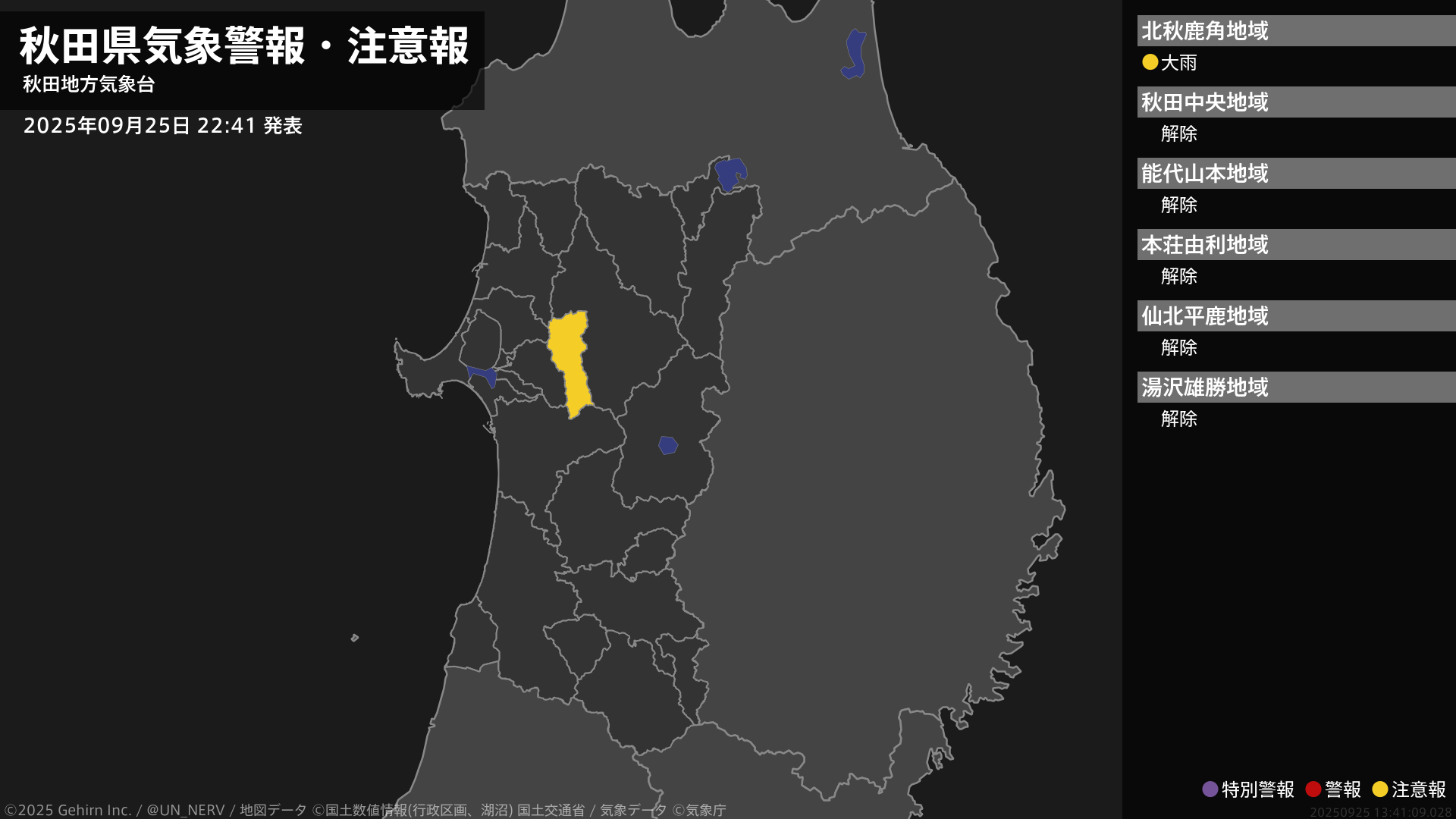 【秋田県 気象警報・注意報 2025年09月25日 22:41】内陸では、26日明け方まで土砂災害に注意してください。#気象警報注意報 #秋田県