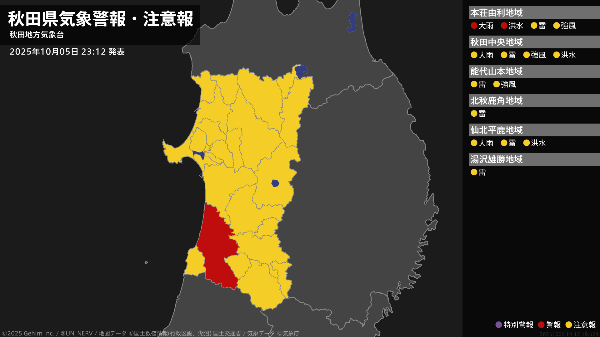 【秋田県 気象警報・注意報 2025年10月05日 23:12】
