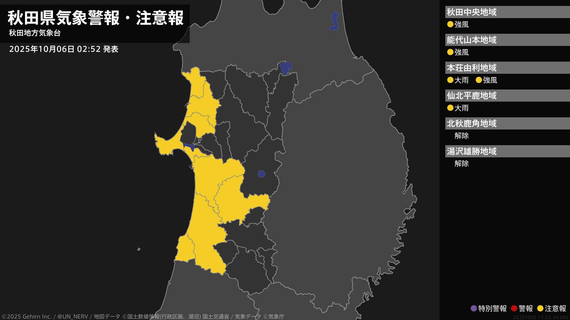【秋田県 気象警報・注意報 2025年10月06日 02:52】