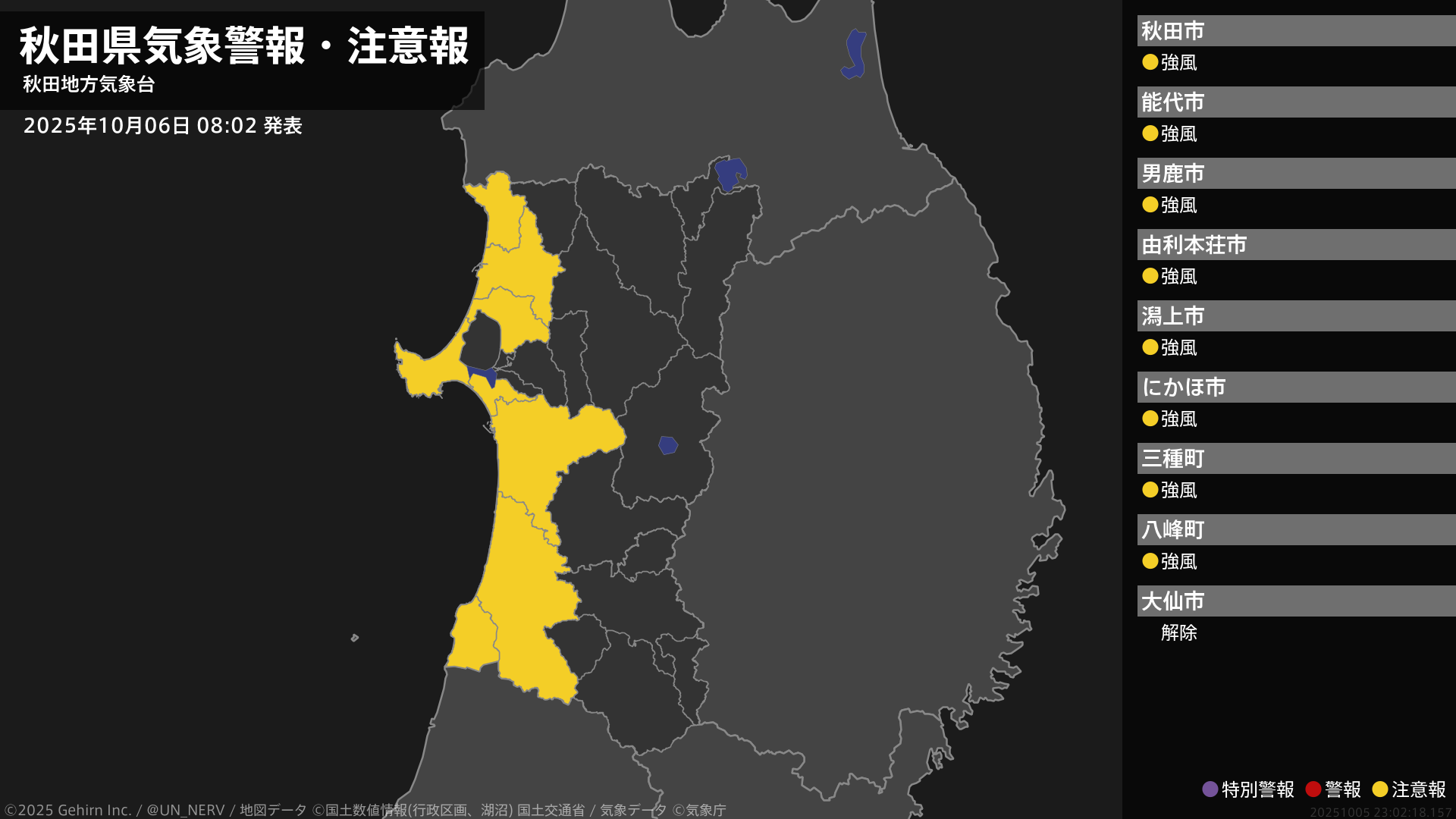 【秋田県 気象警報・注意報 2025年10月06日 08:02】