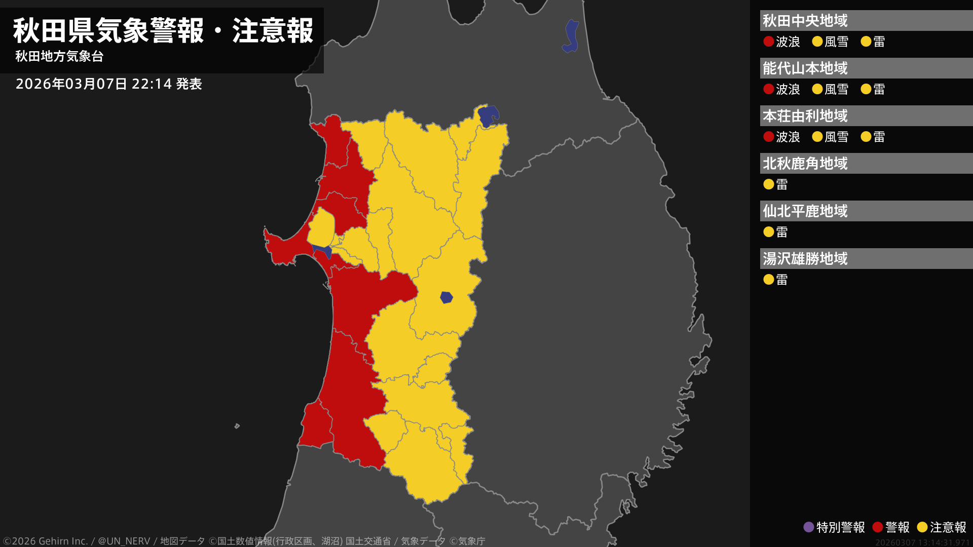 【秋田県 気象警報・注意報 2026年03月07日 22:14】沿岸では、8日明け方まで高波に警戒してください。#気象警報注意報 #秋田県