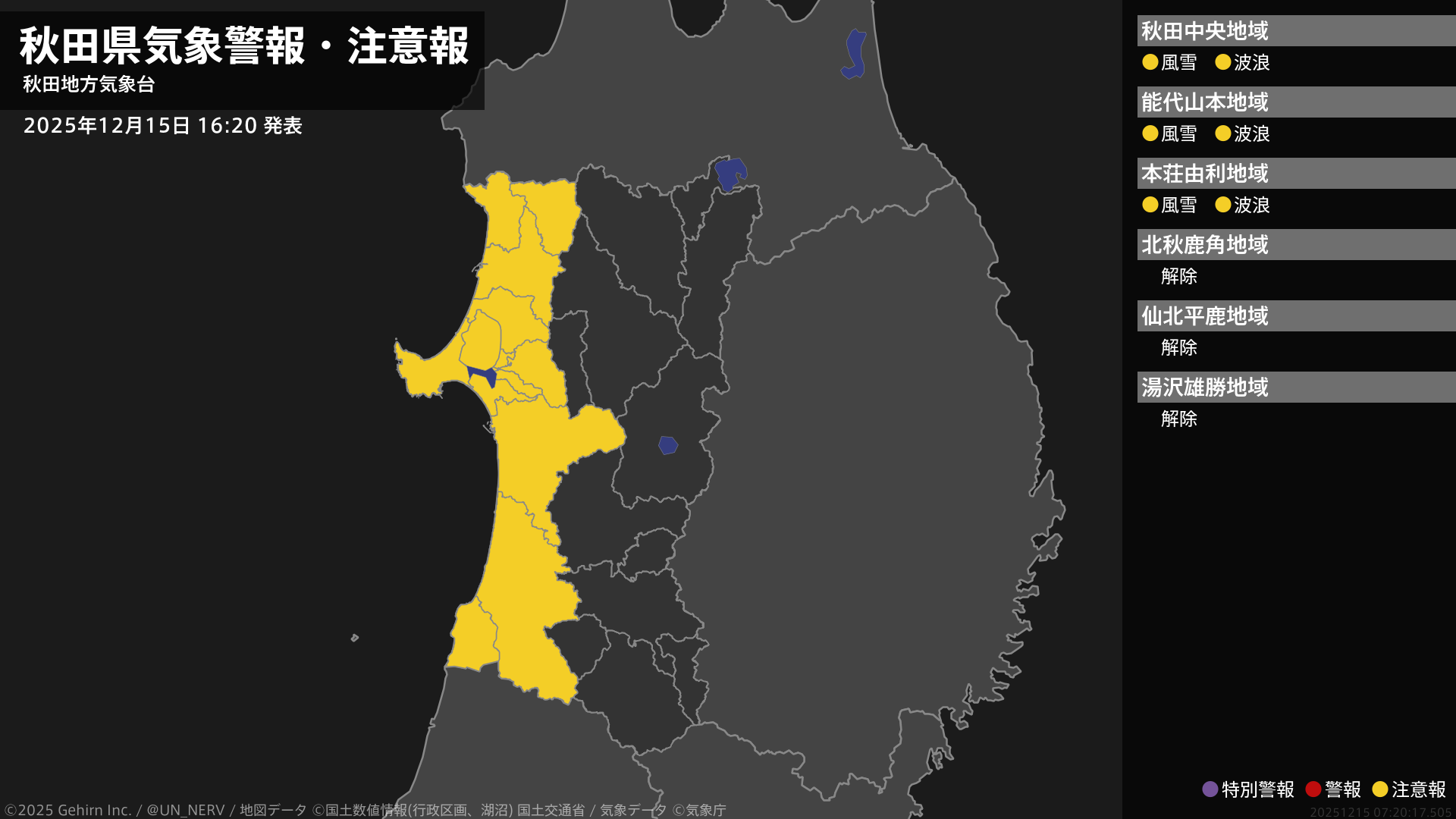 【秋田県 気象警報・注意報 2025年12月15日 16:20】沿岸では、15日夜遅くまで風雪に、16日明け方まで高波に注意してください。#気象警報注意報 #秋田県