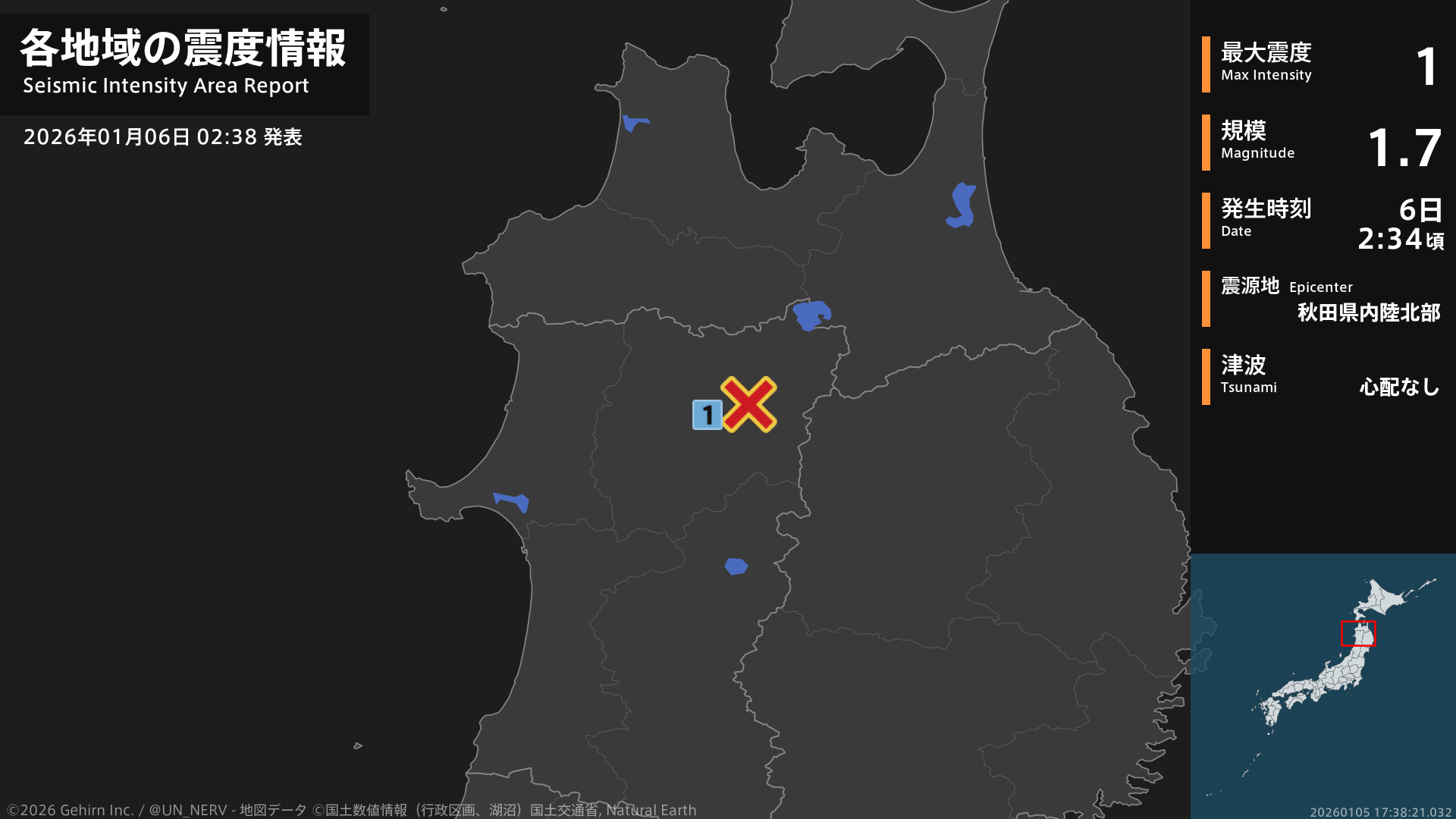 【地震情報 2026年1月6日】2時34分頃、秋田県内陸北部を震源とする地震がありました。震源の深さはごく浅い、地震の規模はM1.7、最大震度1を秋田県で観測しています。この地震による津波の心配はありません。#地震 #秋田県