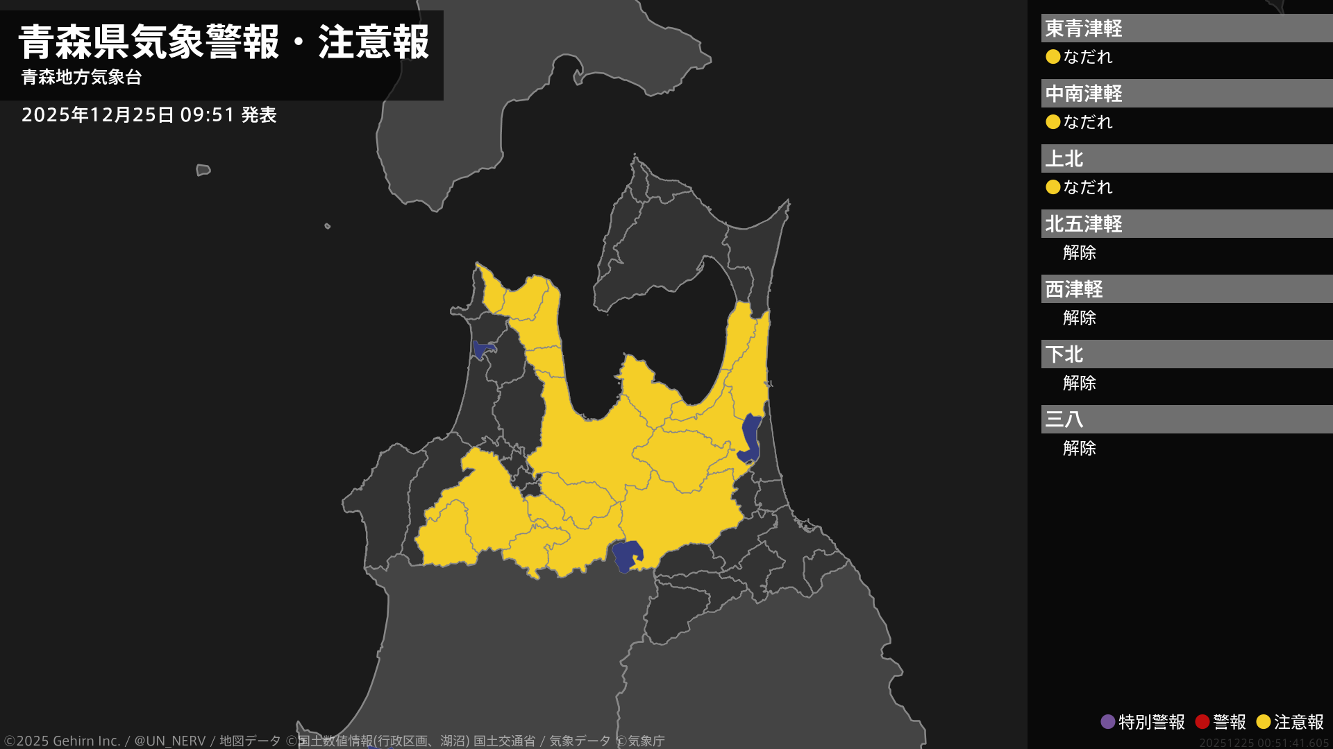 【青森県 気象警報・注意報 2025年12月25日 09:51】