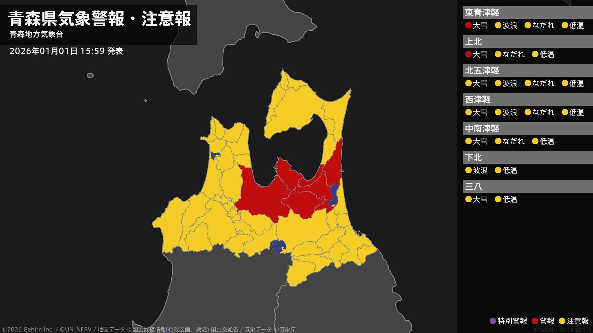 【青森県 気象警報・注意報 2026年01月01日 15:59】津軽、三八上北では、1日夜遅くまで大雪に警戒してください。#気象警報注意報 #青森県
