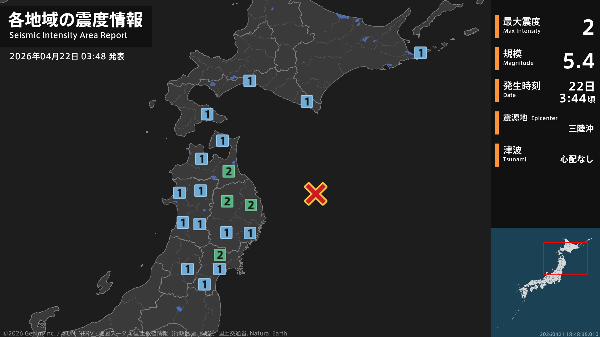3時44分頃、三陸沖を震源とする地震がありました。震源の深さは約10km、地震の規模はM5.4、最大震度2を青森県、岩手県、宮城県で観測しています。この地震による津波の心配はありません。