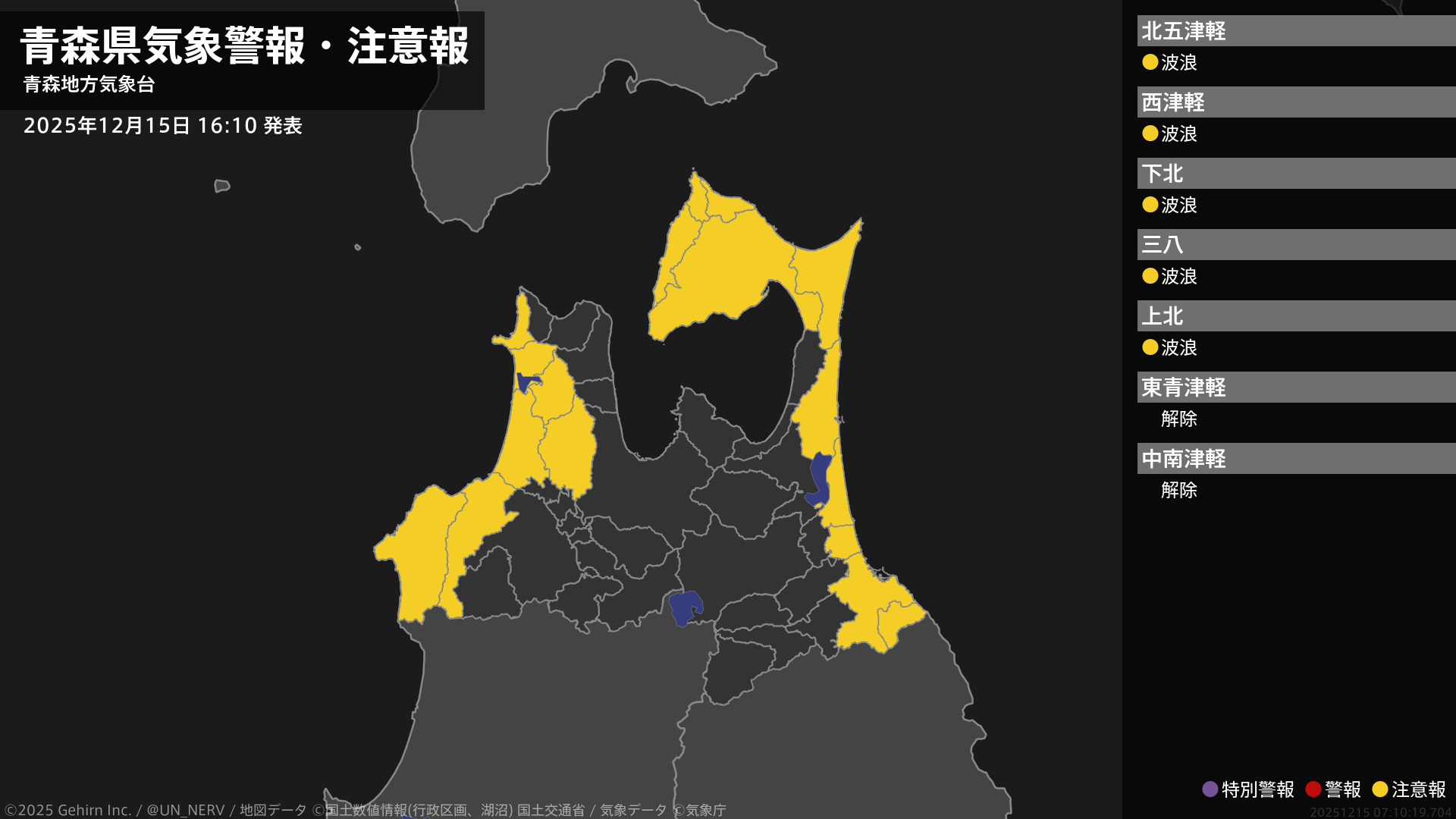 【青森県 気象警報・注意報 2025年12月15日 16:10】