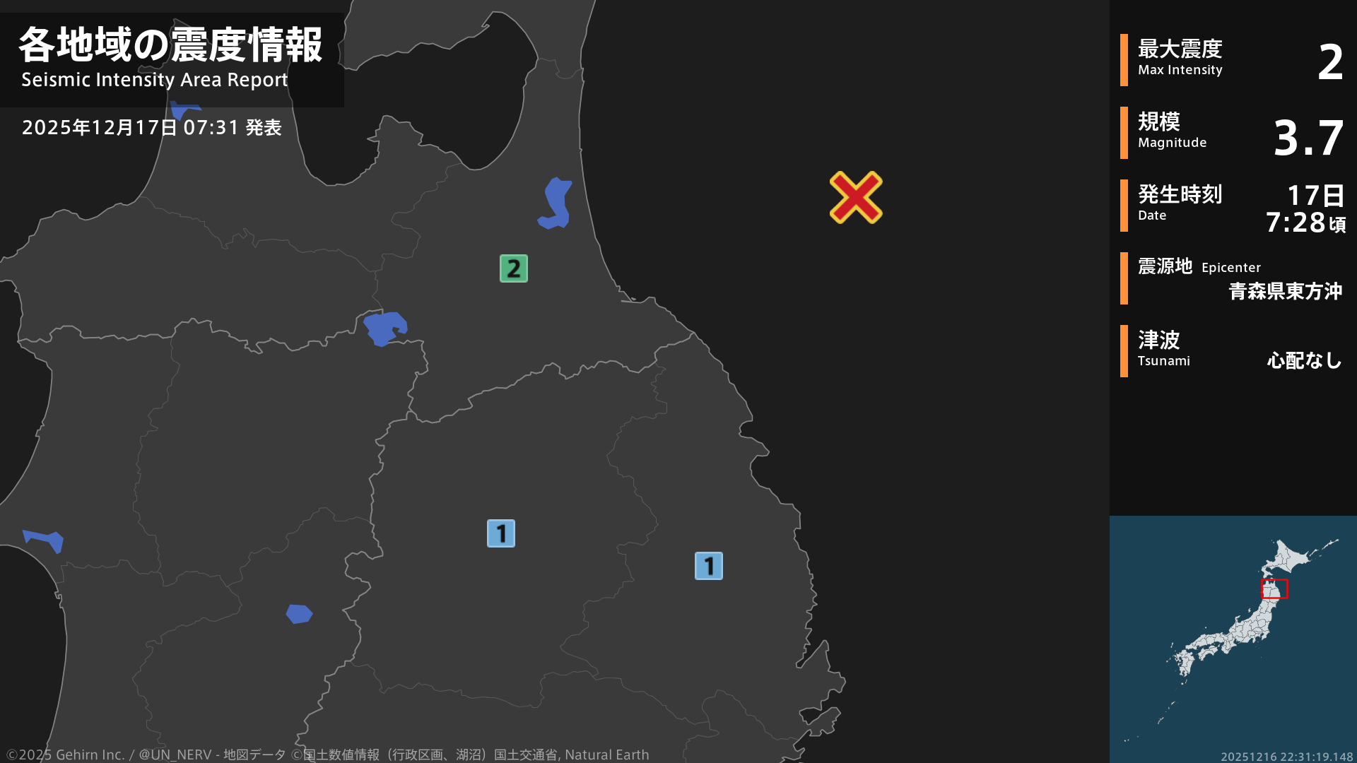 23時53分頃、青森県東方沖を震源とする地震がありました。震源の深さは約60km、地震の規模はM3.7、最大震度1を青森県で観測しています。この地震による津波の心配はありません。
