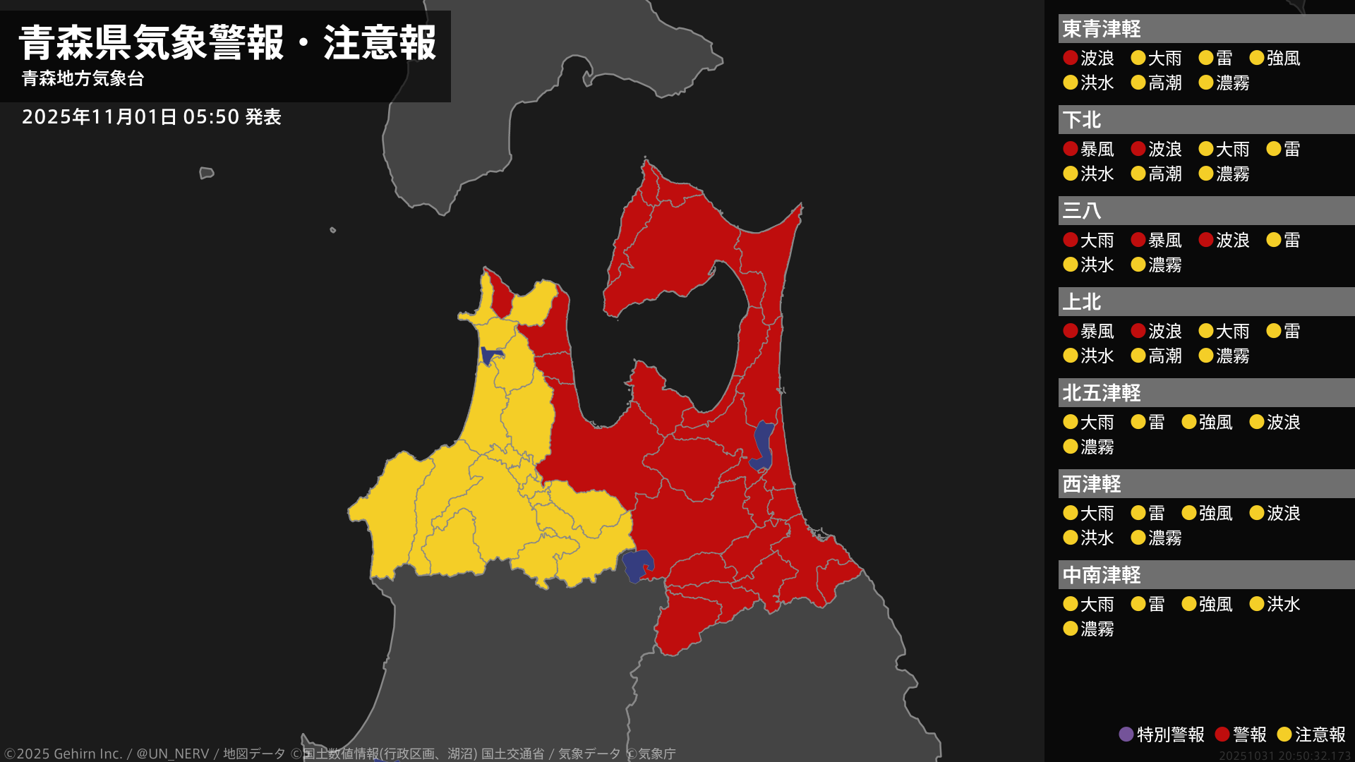 【青森県 気象警報・注意報 2025年11月01日 05:50】三八上北では、低い土地の浸水に警戒してください。下北、三八上北では、暴風に警戒してください。青森県では、高波に警戒してください。#気象警報注意報 #青森県