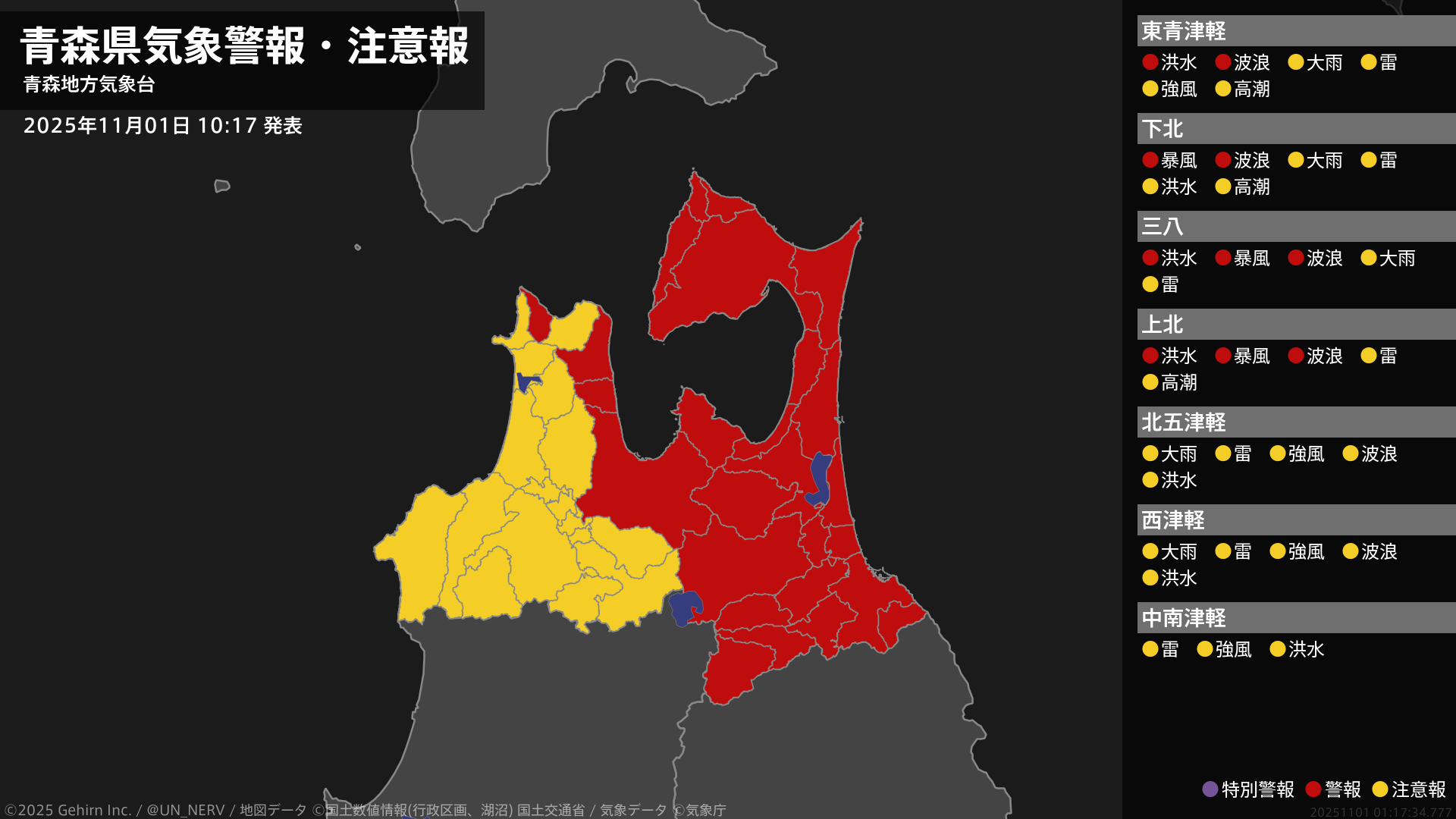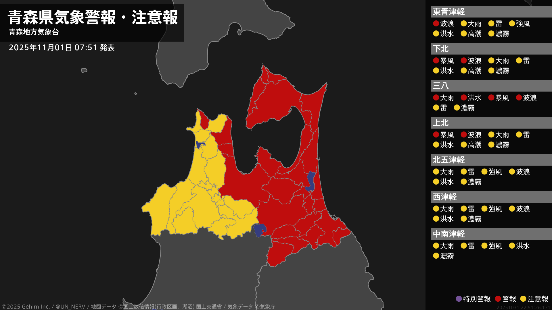 【青森県 気象警報・注意報 2025年11月01日 07:51】三八上北では、土砂災害や低い土地の浸水、河川の増水に警戒してください。下北、三八上北では、暴風に警戒してください。青森県では、高波に警戒してください。#気象警報注意報 #青森県