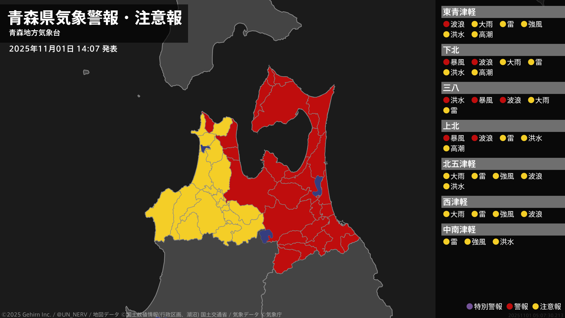 【青森県 気象警報・注意報 2025年11月01日 14:07】三八上北では、1日夕方まで河川の増水に警戒してください。下北、三八上北では、1日夕方まで暴風に警戒してください。青森県では、1日夕方まで高波に警戒してください。#気象警報注意報 #青森県