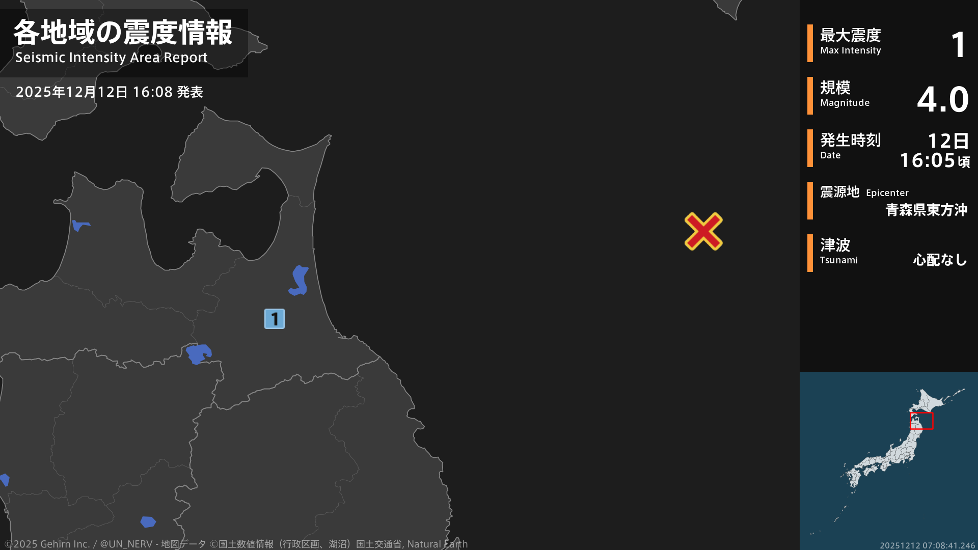 【地震情報 2025年12月12日】16時5分頃、青森県東方沖を震源とする地震がありました。震源の深さは約20km、地震の規模はM4.0、最大震度1を青森県で観測しています。この地震による津波の心配はありません。#地震 #青森県