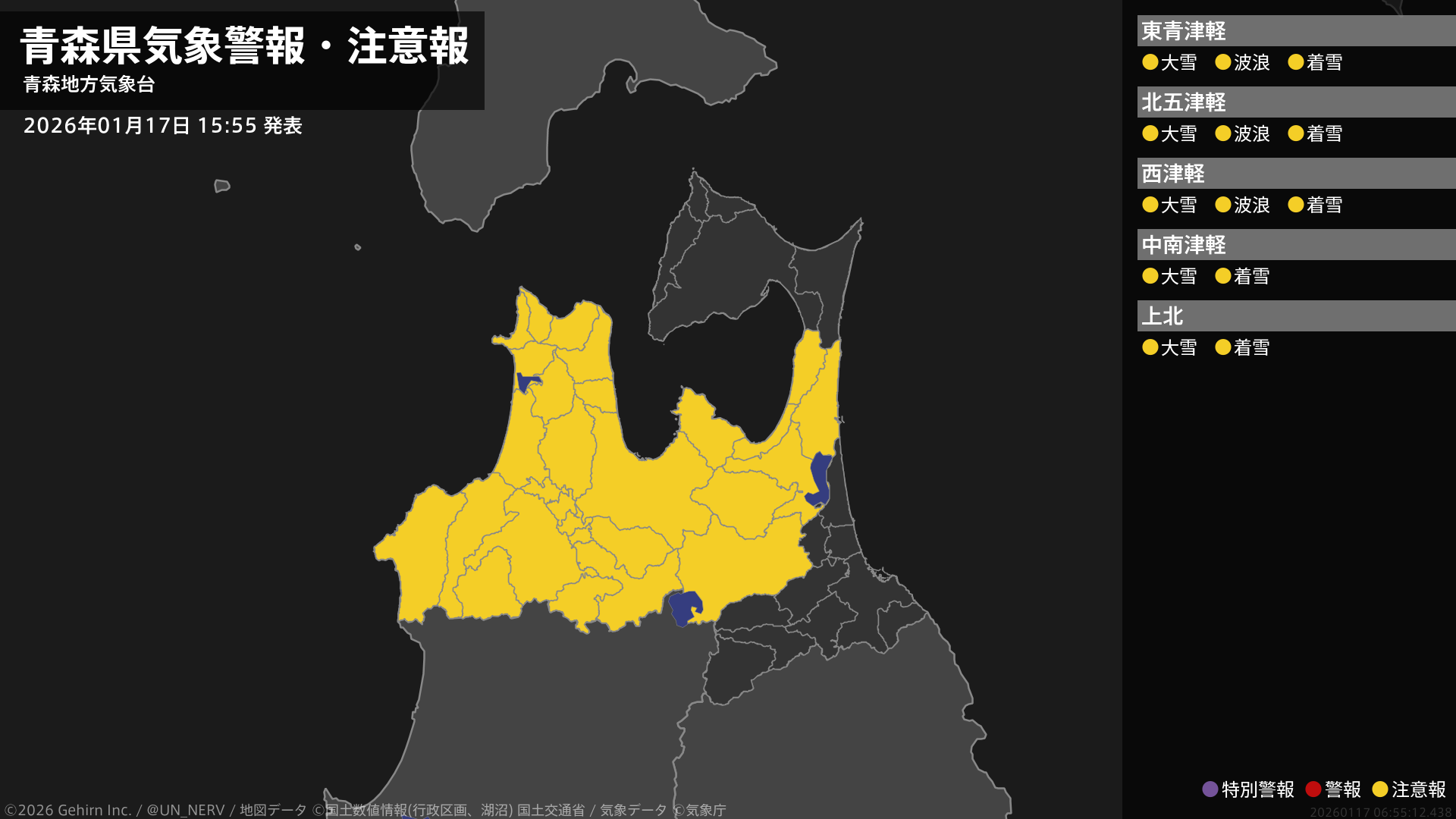 【青森県 気象警報・注意報 2026年01月17日 15:55】津軽、三八上北では、17日夜遅くから18日昼前まで大雪や電線等への着雪に注意してください。津軽では、17日夜のはじめ頃から高波に注意してください。#気象警報注意報 #青森県