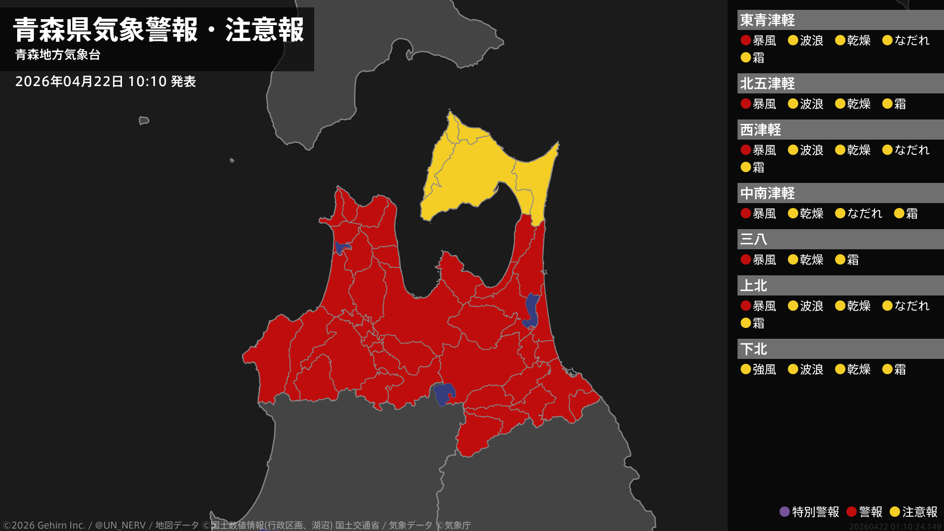 【青森県 気象警報・注意報 2026年04月22日 10:10】津軽、三八上北では、22日夕方まで暴風に警戒してください。#気象警報注意報 #青森県