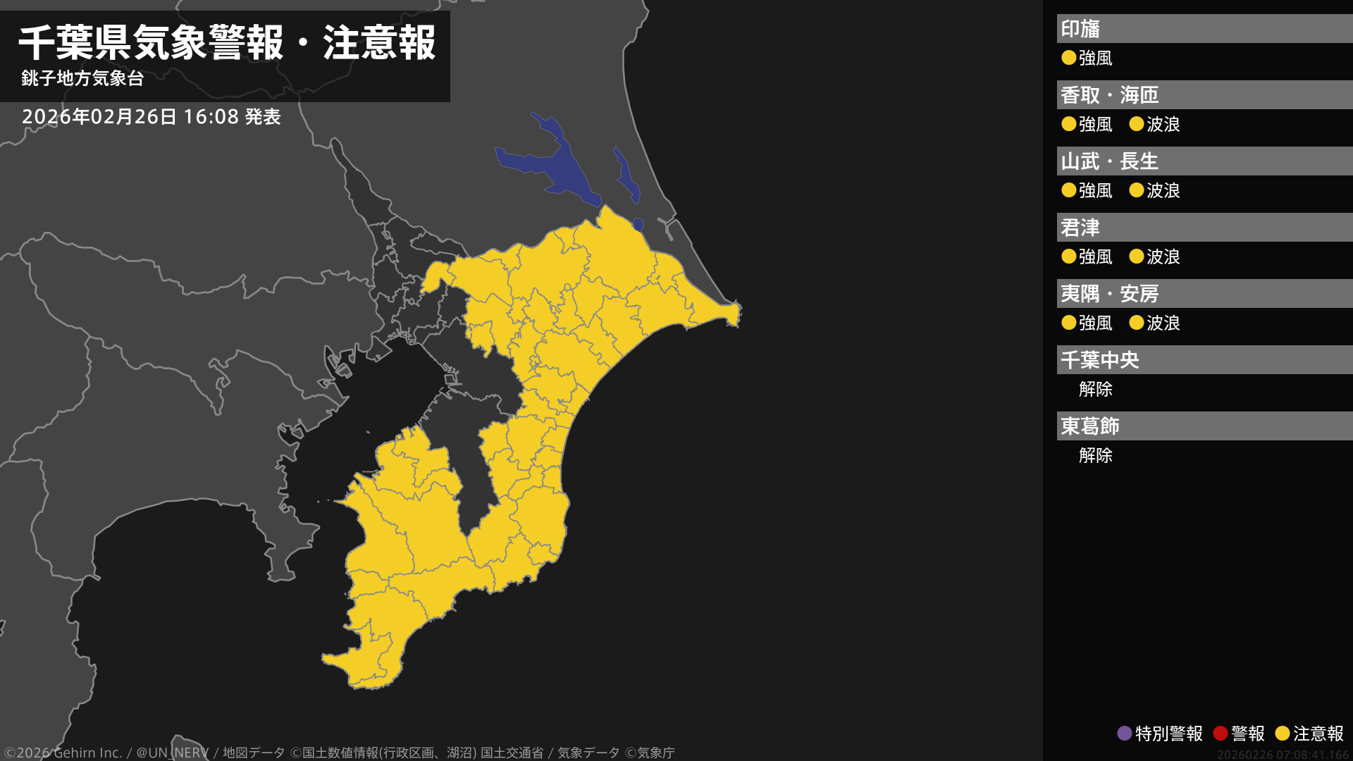 【千葉県 気象警報・注意報 2026年02月26日 16:08】千葉県では、強風に注意してください。北東部、南部では、高波に注意してください。#気象警報注意報 #千葉県