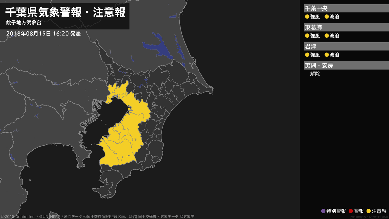 【千葉県 気象警報・注意報 2018年08月15日 16:20】