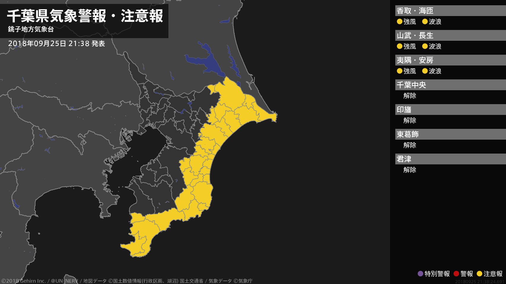 【千葉県 気象警報・注意報 2018年09月25日 21:38】北東部、南部では、強風や高波に注意してください。#気象警報注意報 #千葉県