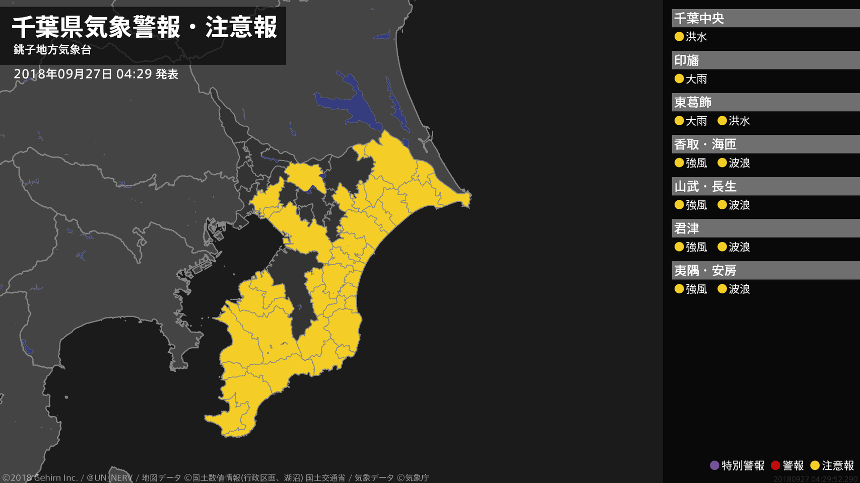 【千葉県 気象警報・注意報 2018年09月27日 04:29】北西部では、低い土地の浸水や河川の増水に注意してください。北東部、南部では、強風や高波に注意してください。#気象警報注意報 #千葉県