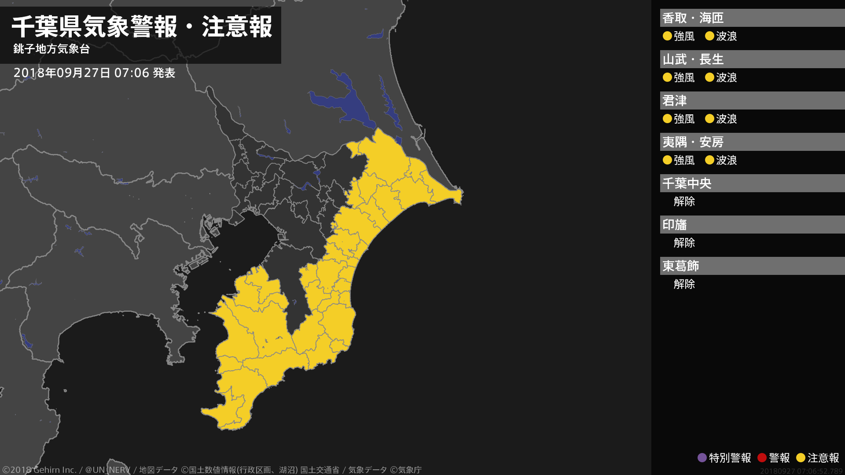 【千葉県 気象警報・注意報 2018年09月27日 07:06】北東部、南部では、強風や高波に注意してください。#気象警報注意報 #千葉県
