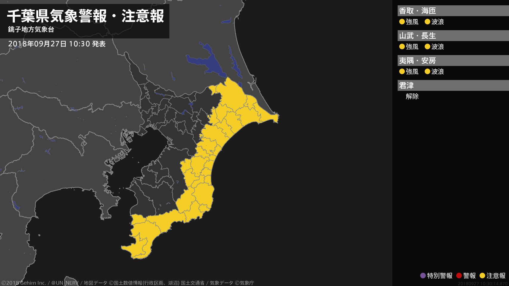 【千葉県 気象警報・注意報 2018年09月27日 10:30】北東部、南部では、強風や高波に注意してください。#気象警報注意報 #千葉県