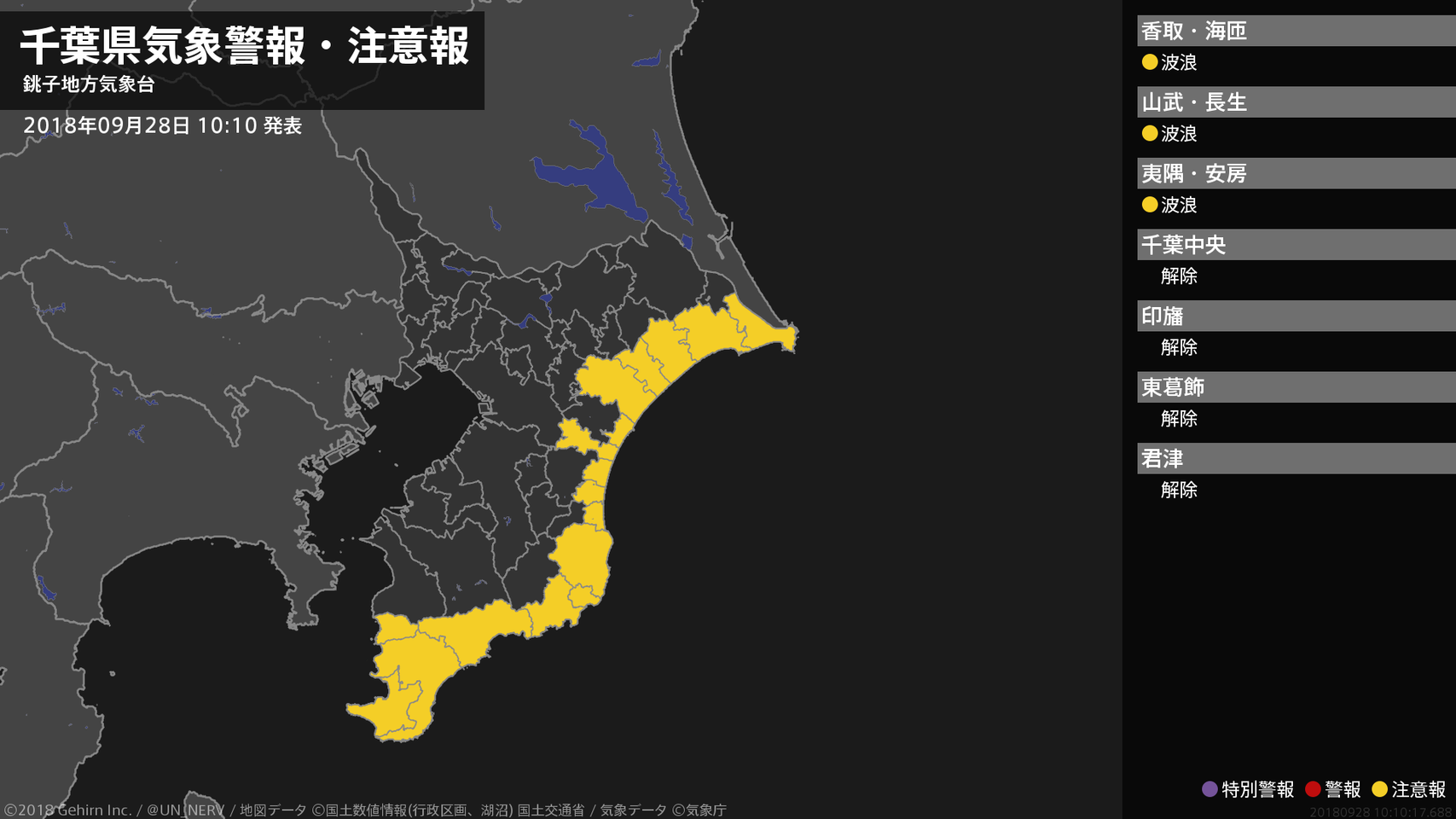 【千葉県 気象警報・注意報 2018年09月28日 10:10】北東部、南部では、高波に注意してください。#気象警報注意報 #千葉県