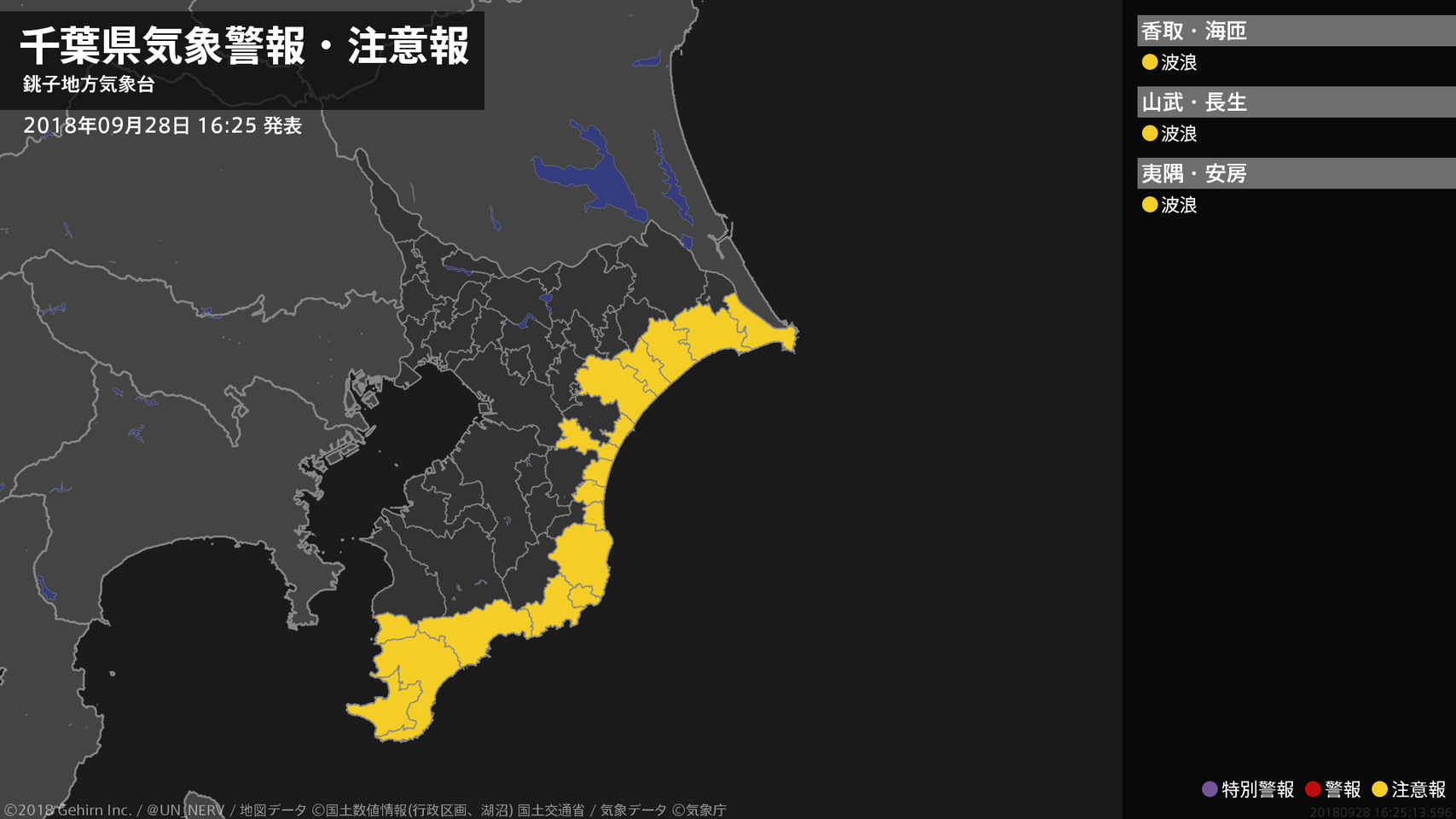 【千葉県 気象警報・注意報 2018年09月28日 16:25】北東部、南部では、高波に注意してください。#気象警報注意報 #千葉県