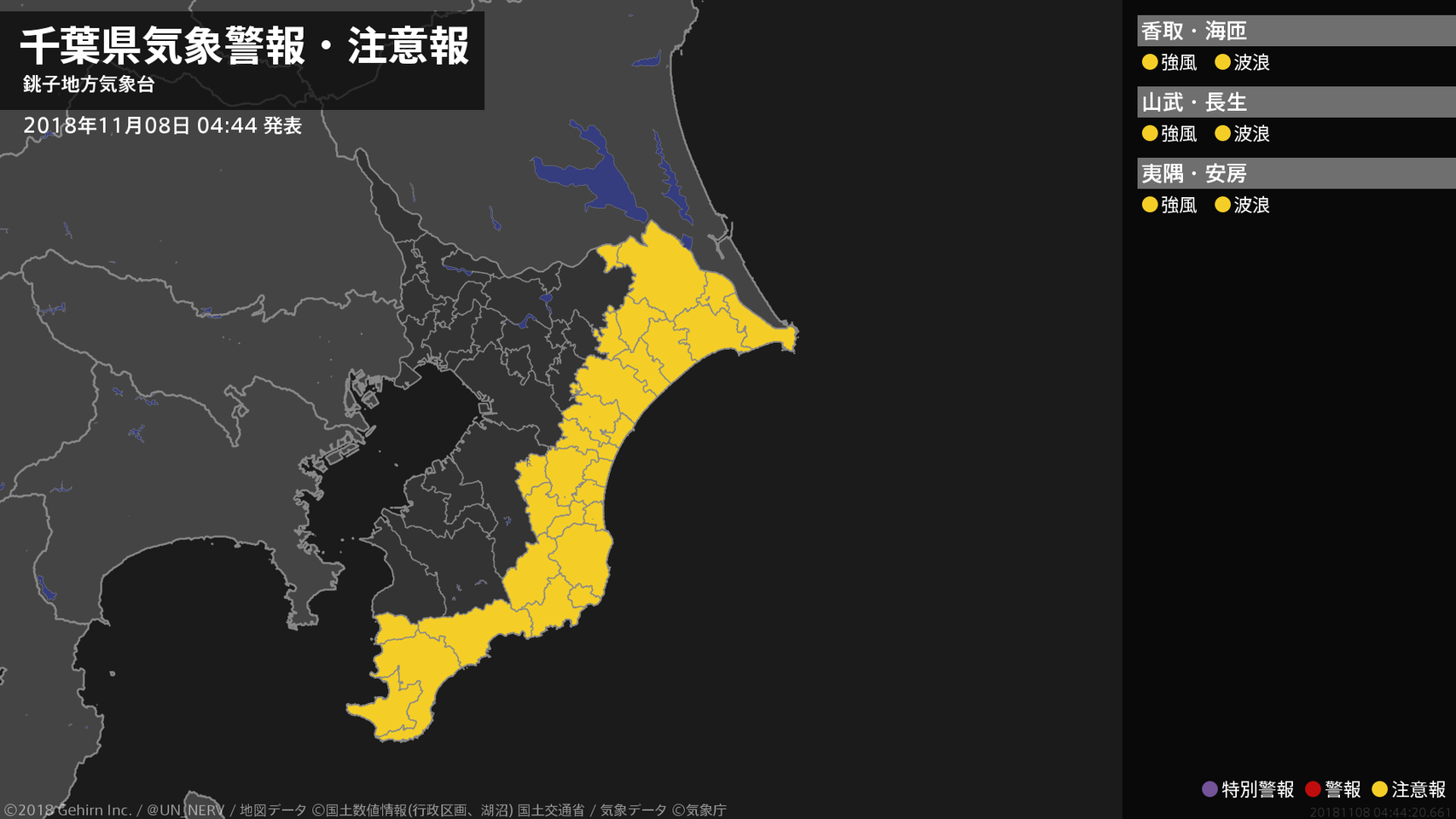 【千葉県 気象警報・注意報 2018年11月08日 04:44】