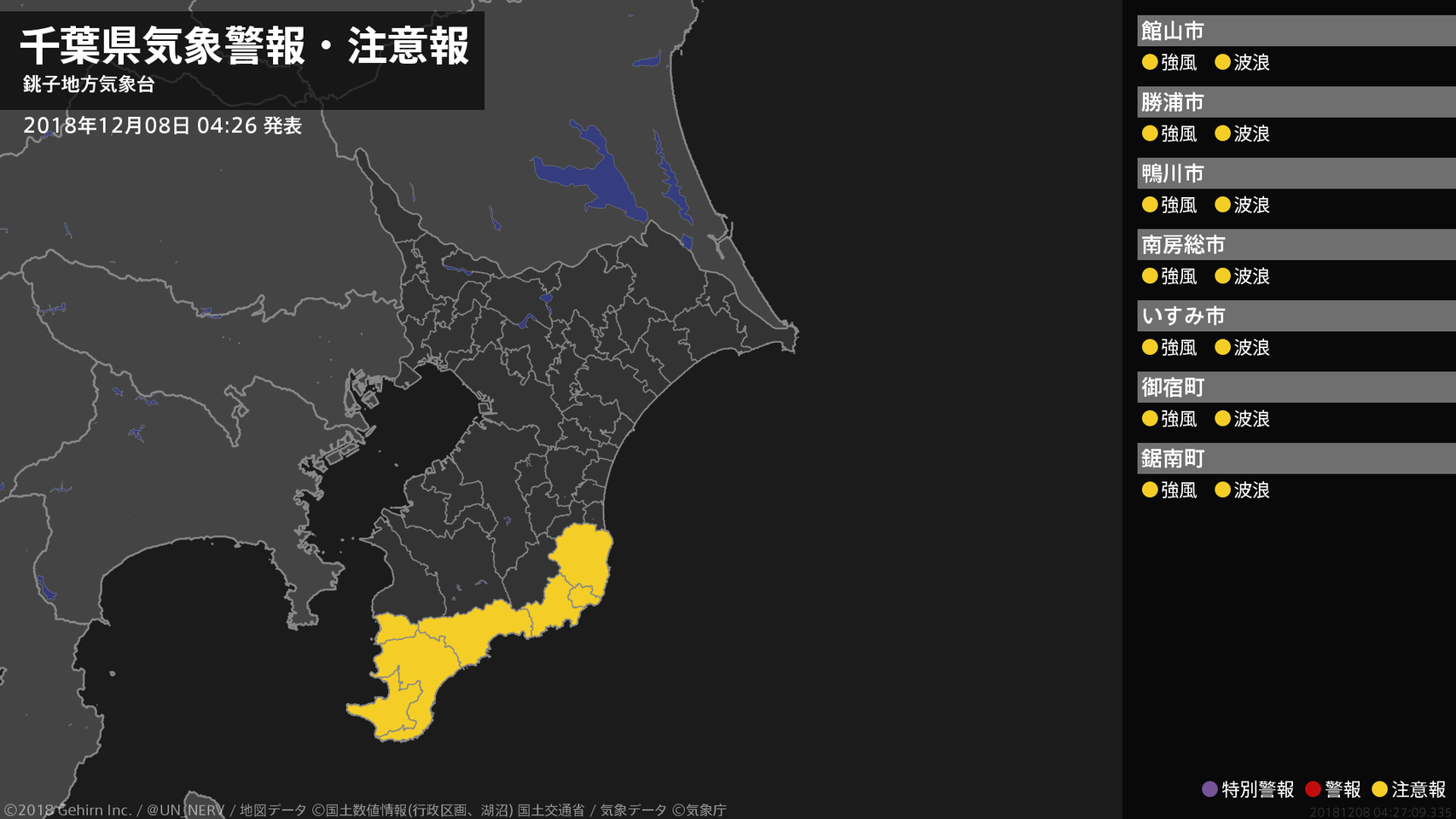【千葉県 気象警報・注意報 2018年12月08日 04:27】