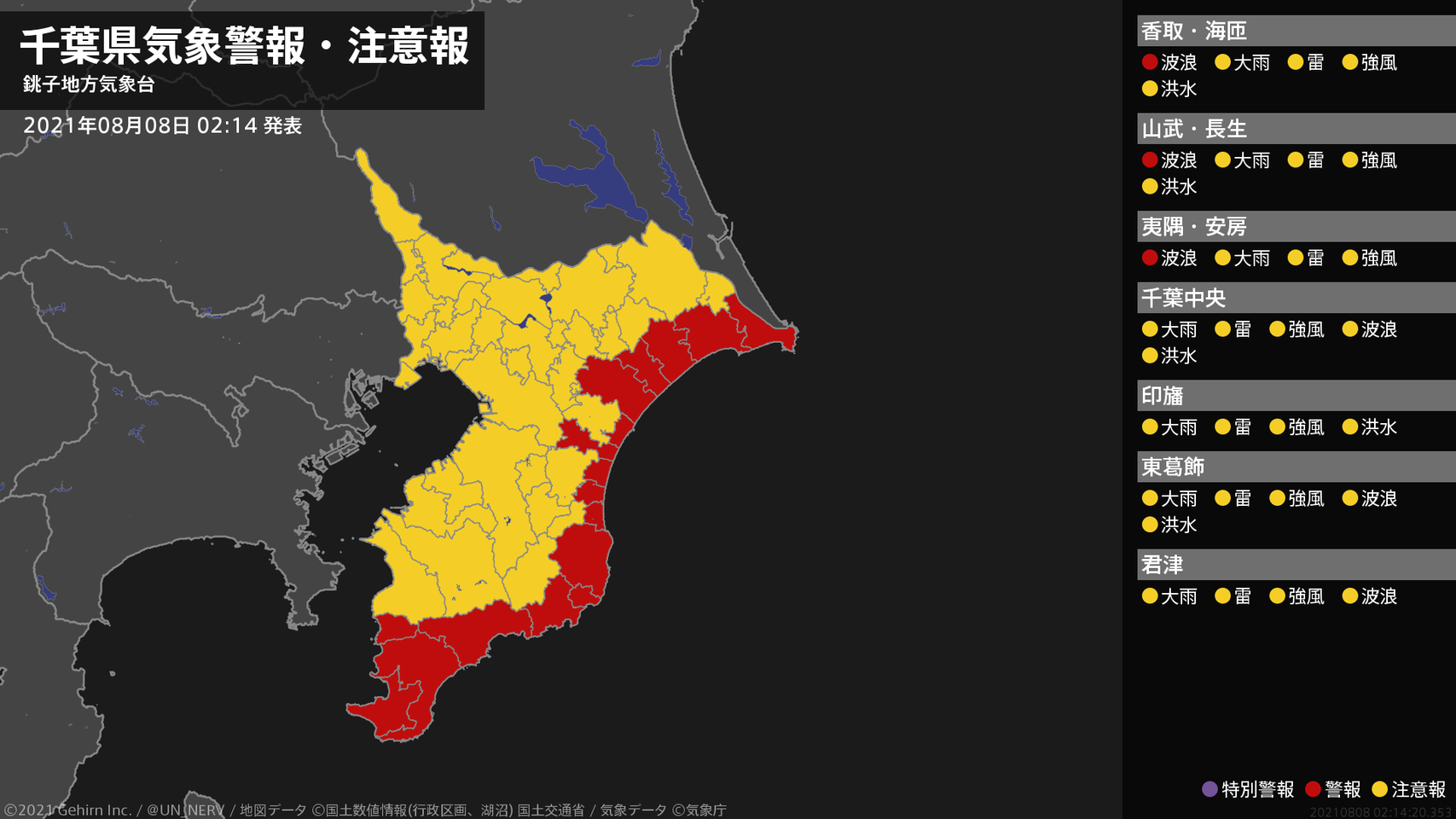 【千葉県 気象警報・注意報 2021年08月08日 02:14】