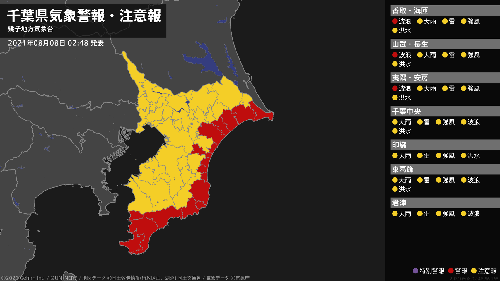 【千葉県 気象警報・注意報 2021年08月08日 02:48】