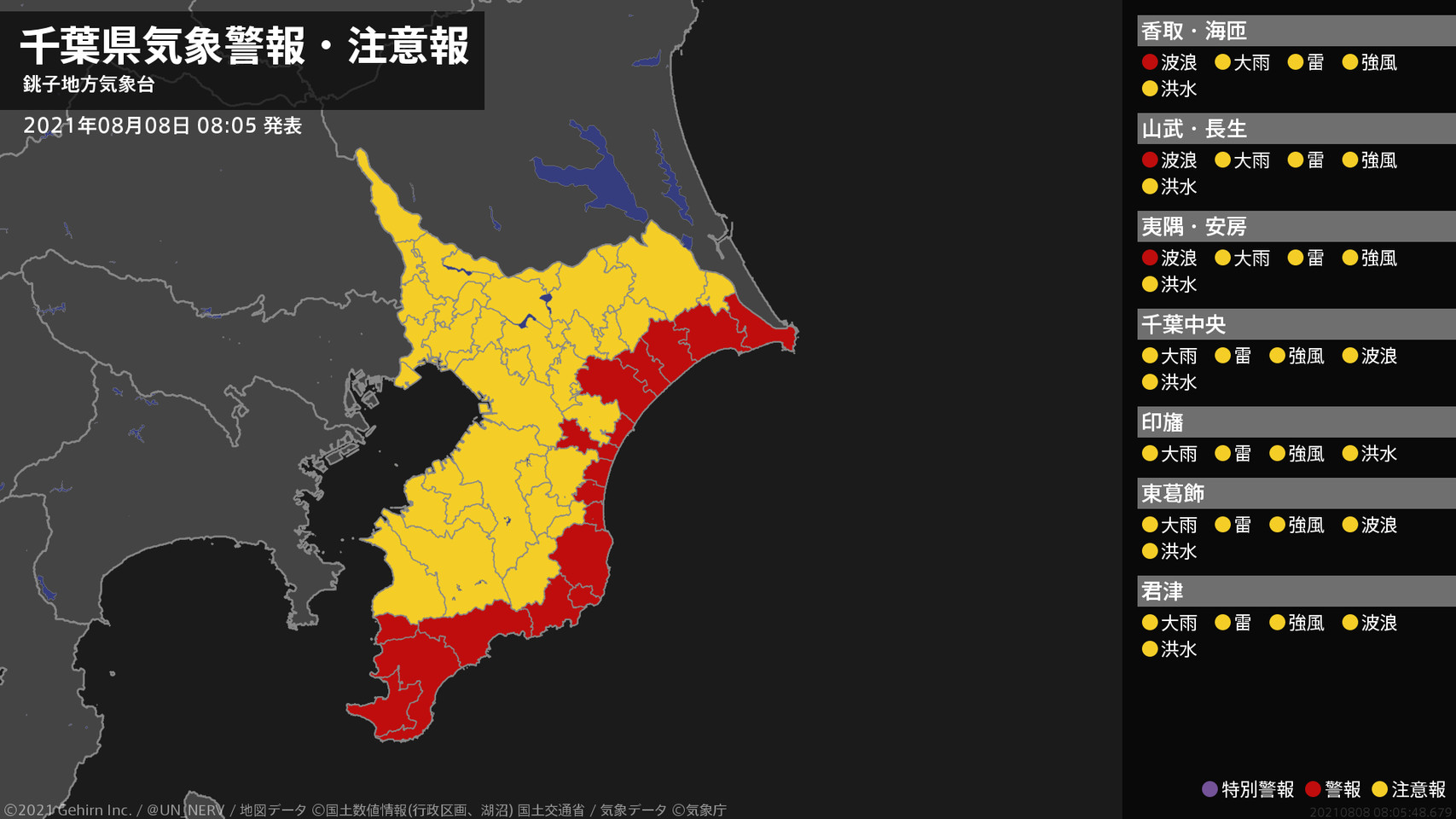 【千葉県 気象警報・注意報 2021年08月08日 08:05】