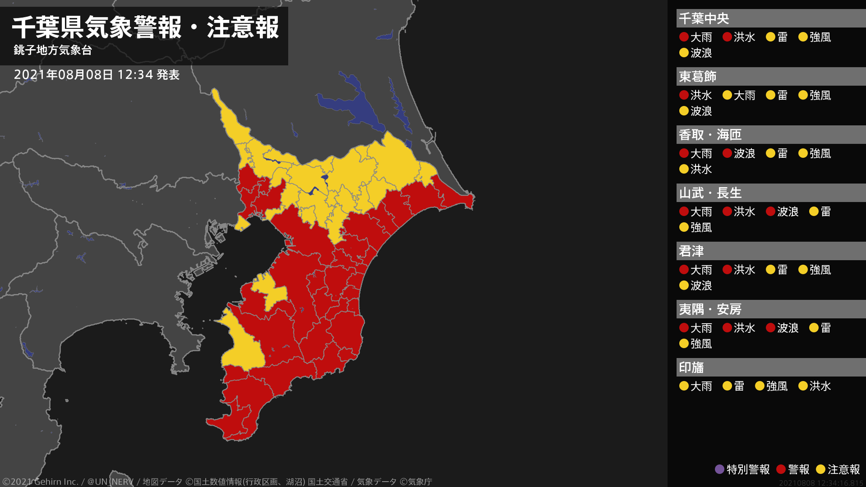 【千葉県 気象警報・注意報 2021年08月08日 12:34】