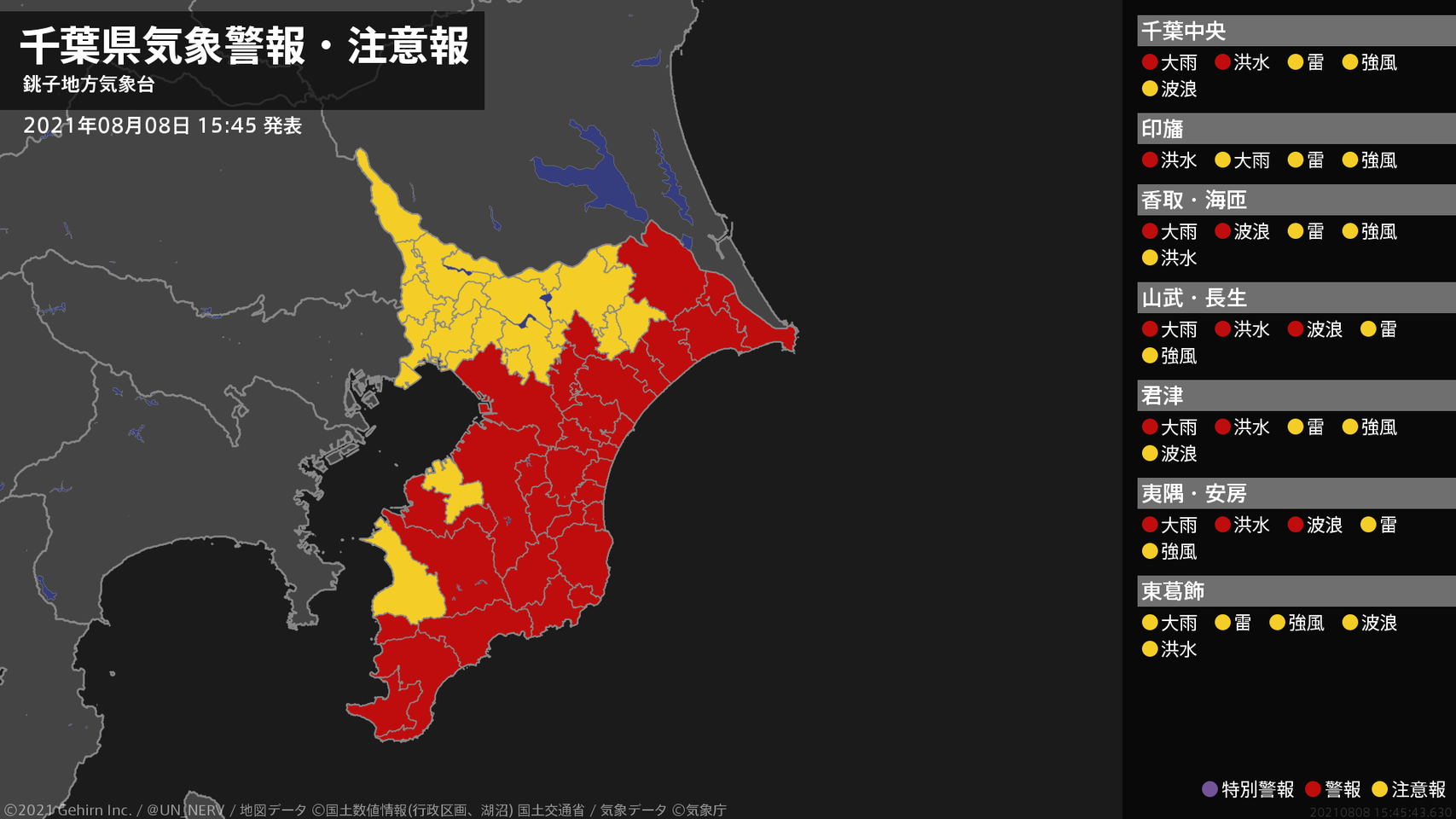 【千葉県 気象警報・注意報 2021年08月08日 15:45】