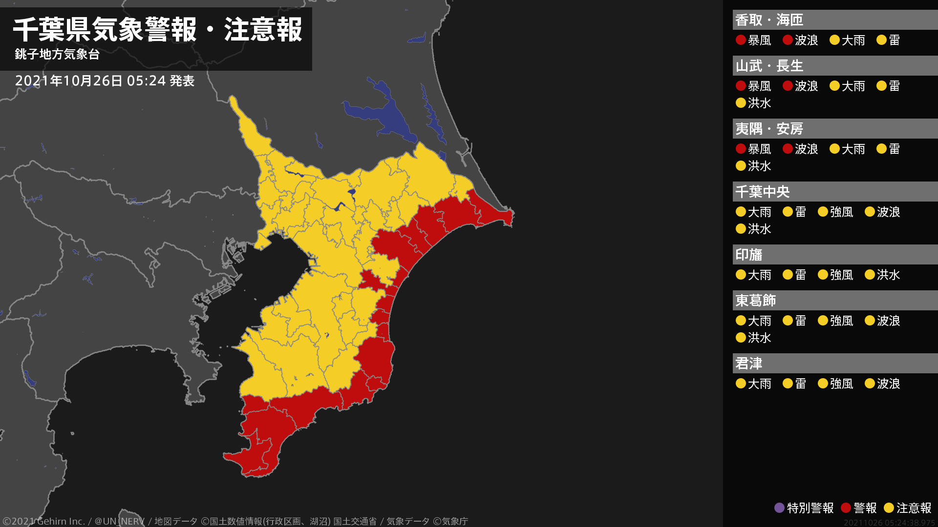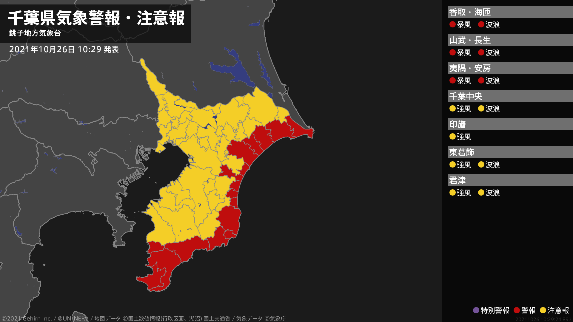 【千葉県 気象警報(解除) 2021年10月26日 11:31】千葉県に発表されていた気象警報はすべて解除されました。#気象警報 #千葉県